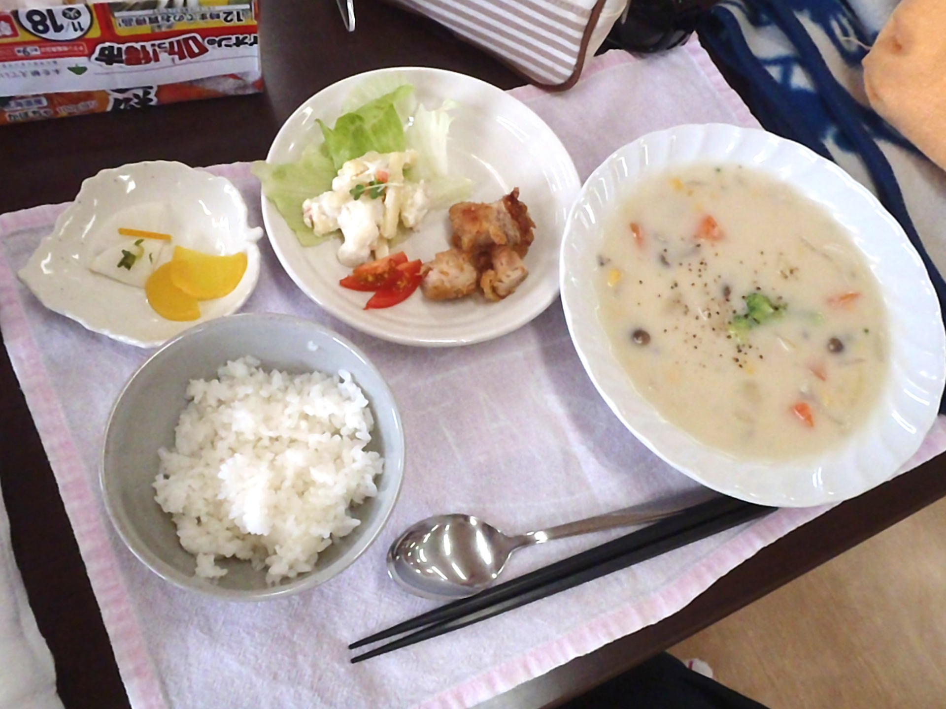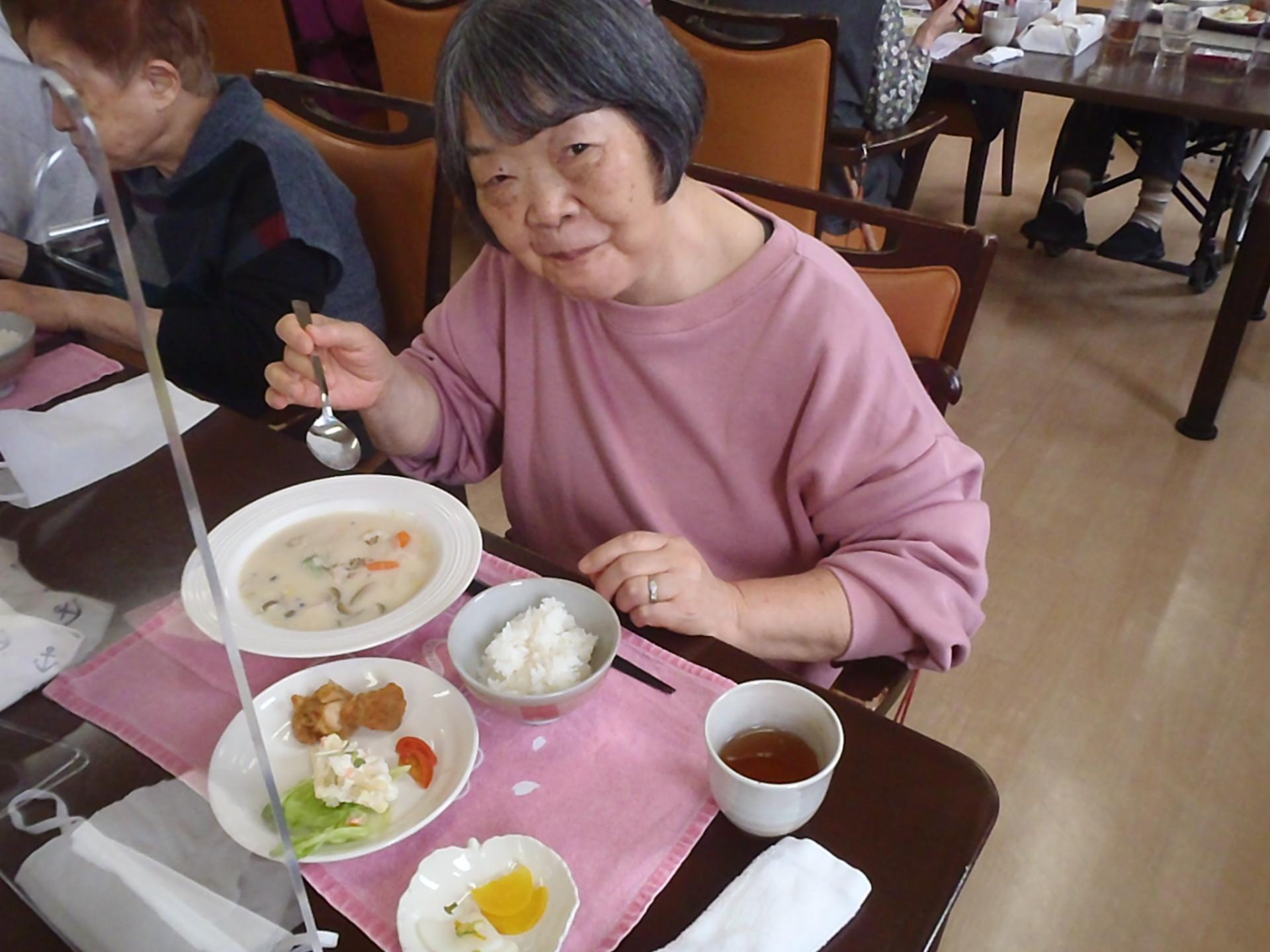 クリスマスにはクリームシチューとサラダ、唐揚げをお出ししました。この日はおやつもクリスマス仕様で