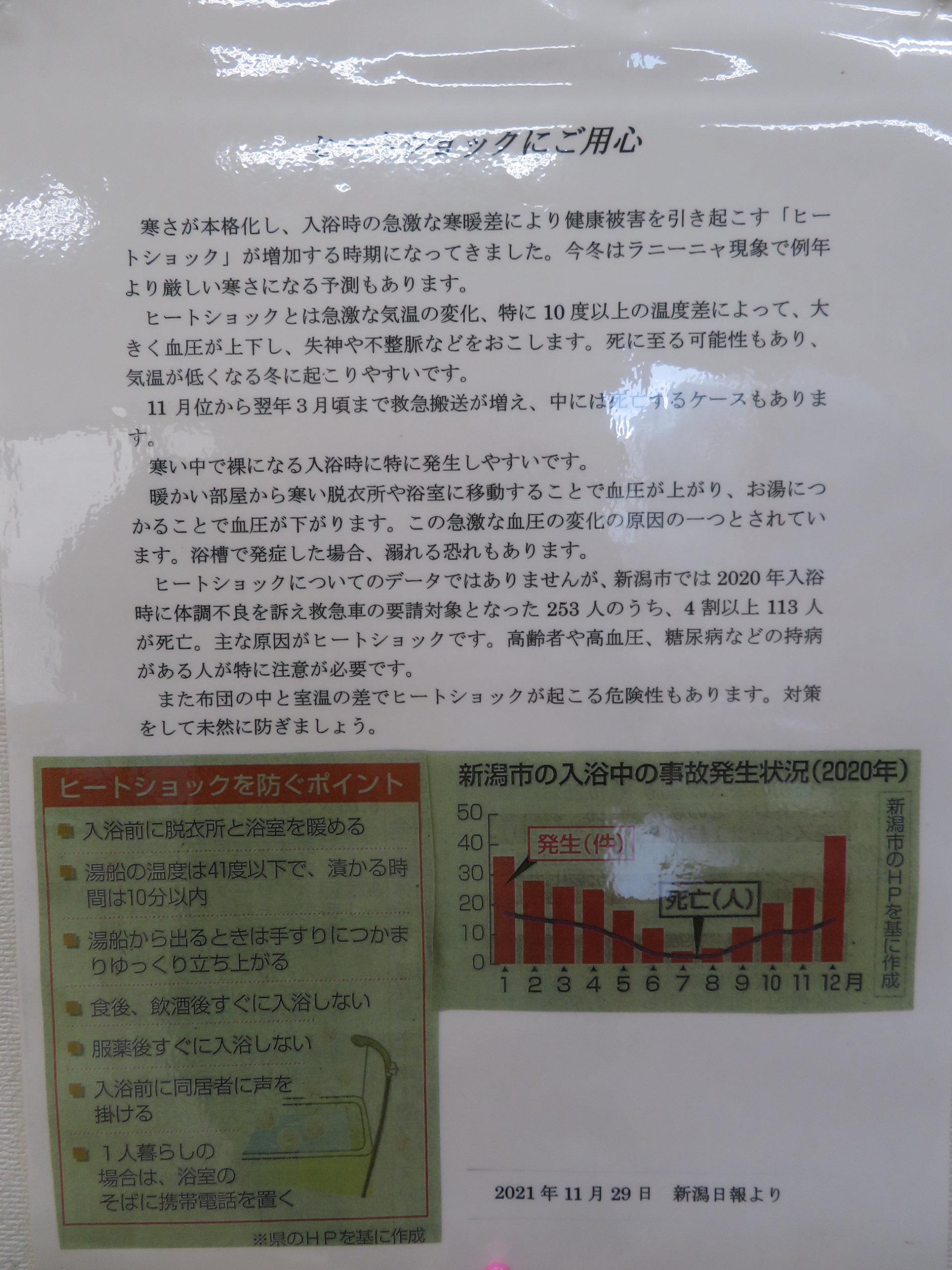 2023/11/18 リハブサロンDoo みなさんご注意ください! こんにちは。リハブサロンDoo看護職員hです。リハブサロンDooでは、その時期に気を付けて頂きたい事柄について、毎月内容を変えてお話させていただいています。11月は寒い季節に特に気をつけて頂きたい「ヒートショック」のお話をしました!また、掲示物も利用して注意喚起させていただいています。 今後とも皆さんのお役に立つ話が出来るようにしていきたいと思います!季節に合わせた生活をして、寒さに負けず、この秋冬を乗り越えていきましょうね。本日もお読みいただきありがとうございました!
