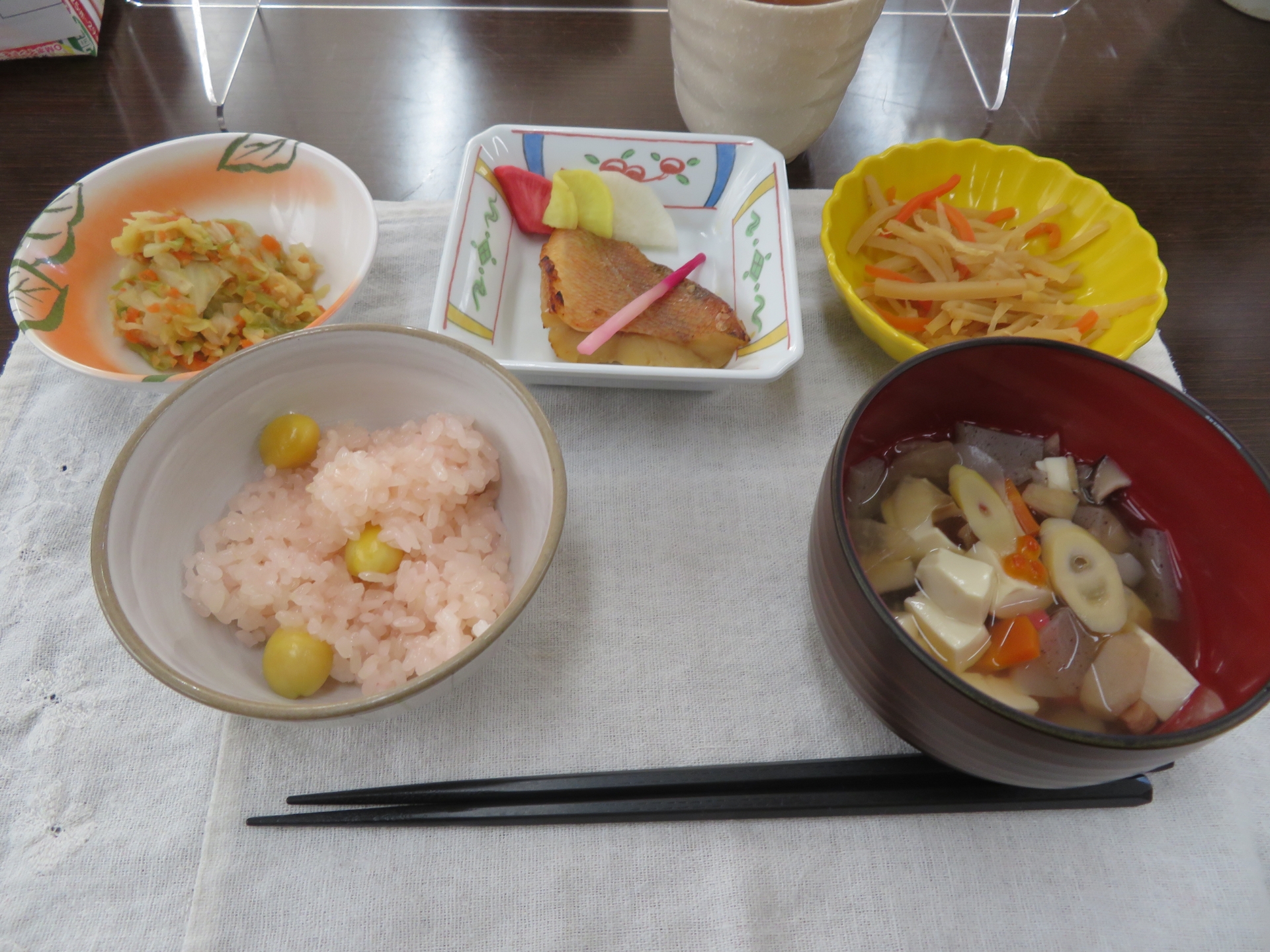 2024/01/13 リハブサロンDoo お赤飯! 皆さんこんばんは。職員kです。先ほどご紹介出来なかったのですが、周年祭ではお昼ご飯にお赤飯を提供しました。私どもの施設で作るお赤飯は、その豊かな赤い色合いと独特のほんのり甘い香りが、まさに割烹の芸術のような料理です。一粒一粒が丁寧に炊かれ、色彩と風味が調和した贅沢な一品。銀杏を交え、食べるたびに上質な味わいと芳醇な香りが楽しめる料理として、贅沢なひとときを提供しました。