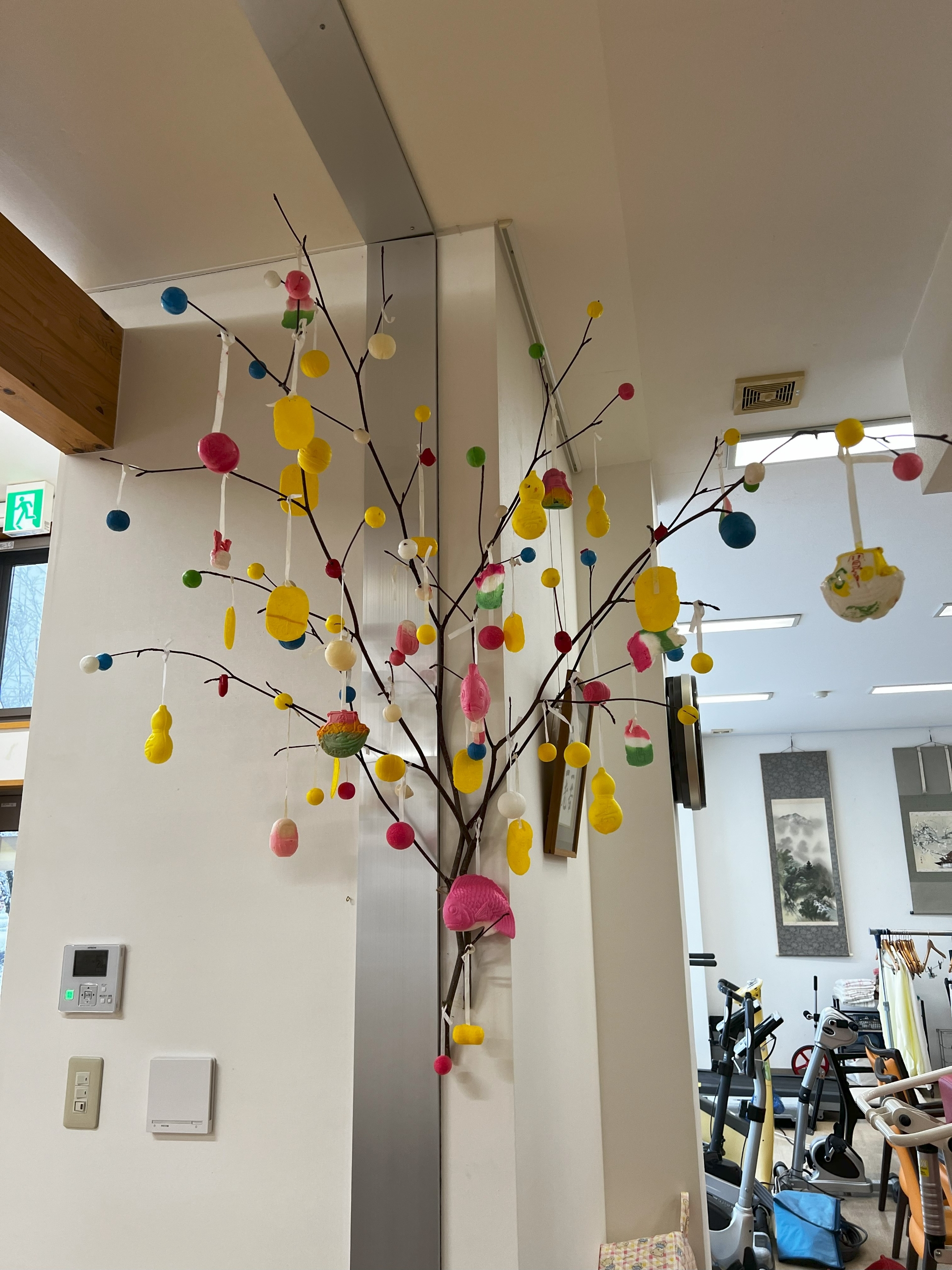 2025/01/15 リハブサロンDoo 繭玉飾り 今年も繭玉飾りをして、ご利用者様の無病息災と家内安全・五穀豊穣を祈願させていただきました。団子の木をお正月に伐ってきて、紅白のお団子を作り繭玉と一緒に飾らせていただきました。正月飾りも終わり、彩も良く壁に映えております。
