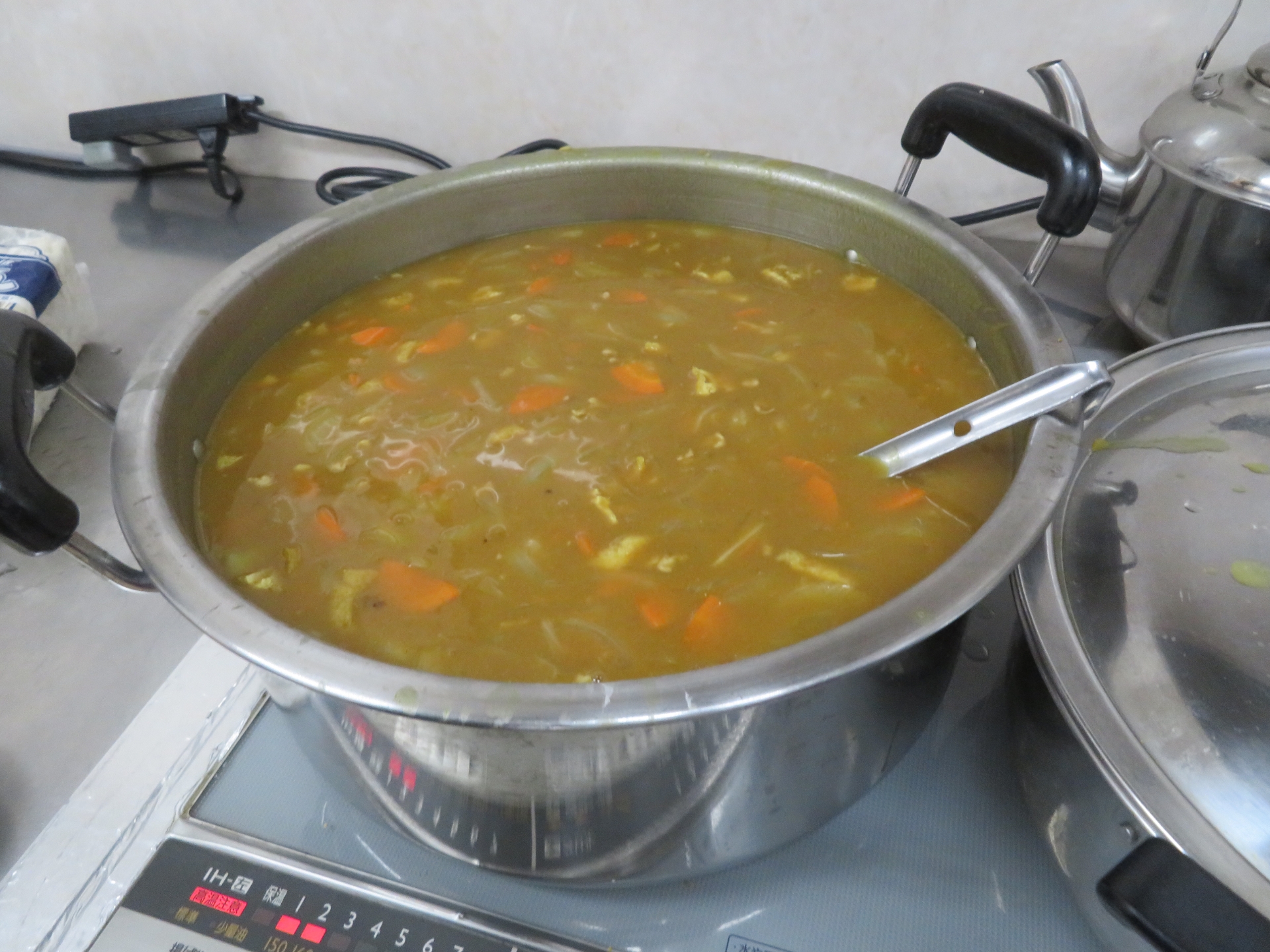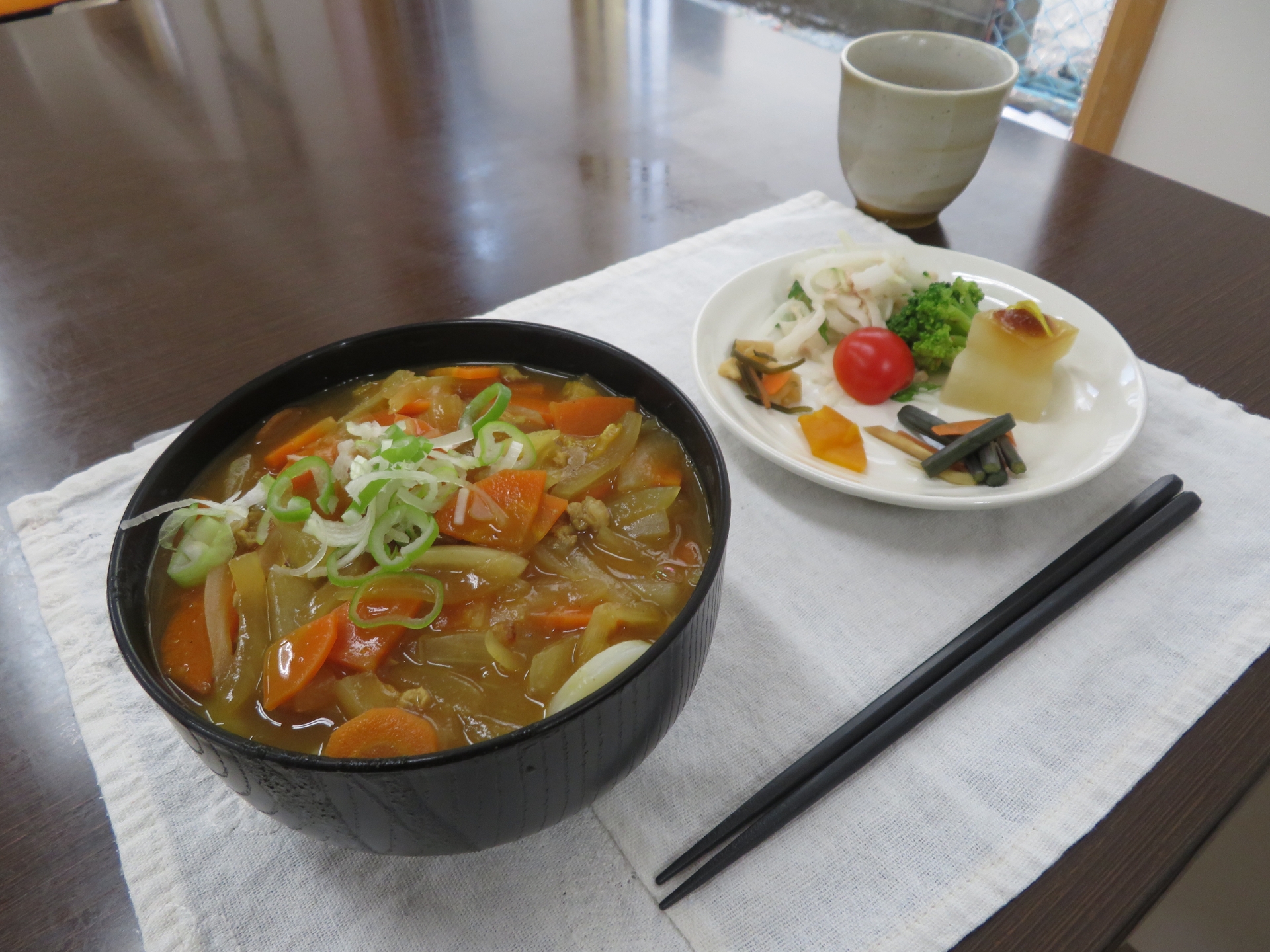 2025/01/15 リハブサロンDoo カレーうどんフェア 今日は朝からの牡丹雪が降り積もり、東区の施設の前はお昼ごろで5cm位も積もりました。そんな中、リハブサロンDooでは昨日、今日と二日間カレーうどんフェアをおこなっております。熱々の餡かけのカレーうどんは体の芯から温まり、普段の1.5倍の量にもかかわらずに皆さま完食されておりました。
