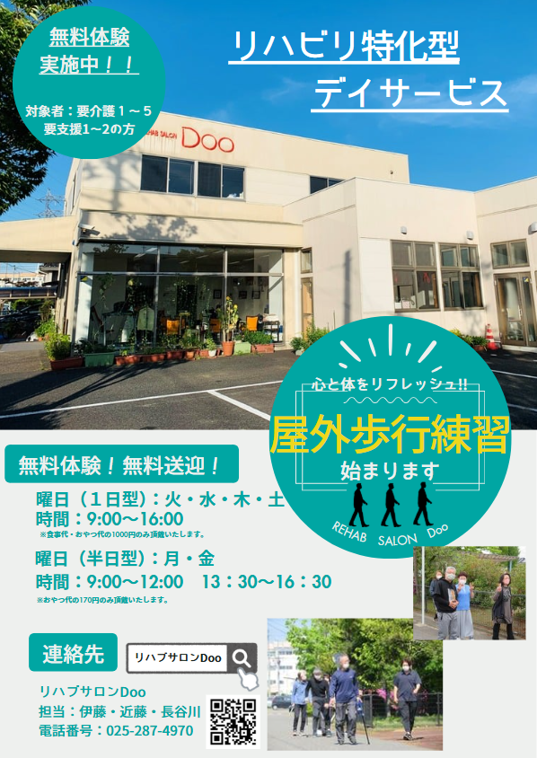 外気温にもよりますが、屋外歩行練習を行える時期になってきましたね。リハブサロンDooの屋外歩行は大勢の利用者様が参加してくださる人気のプログラムとなっております。夏場に室内で運動した成果を屋外で存分に発揮してみてください!