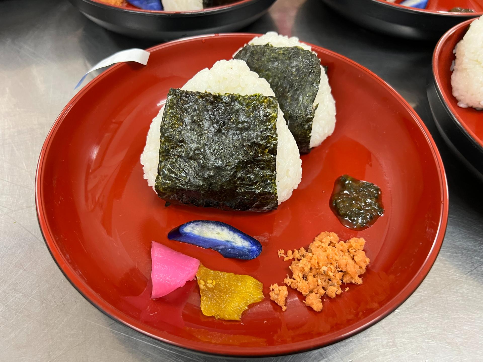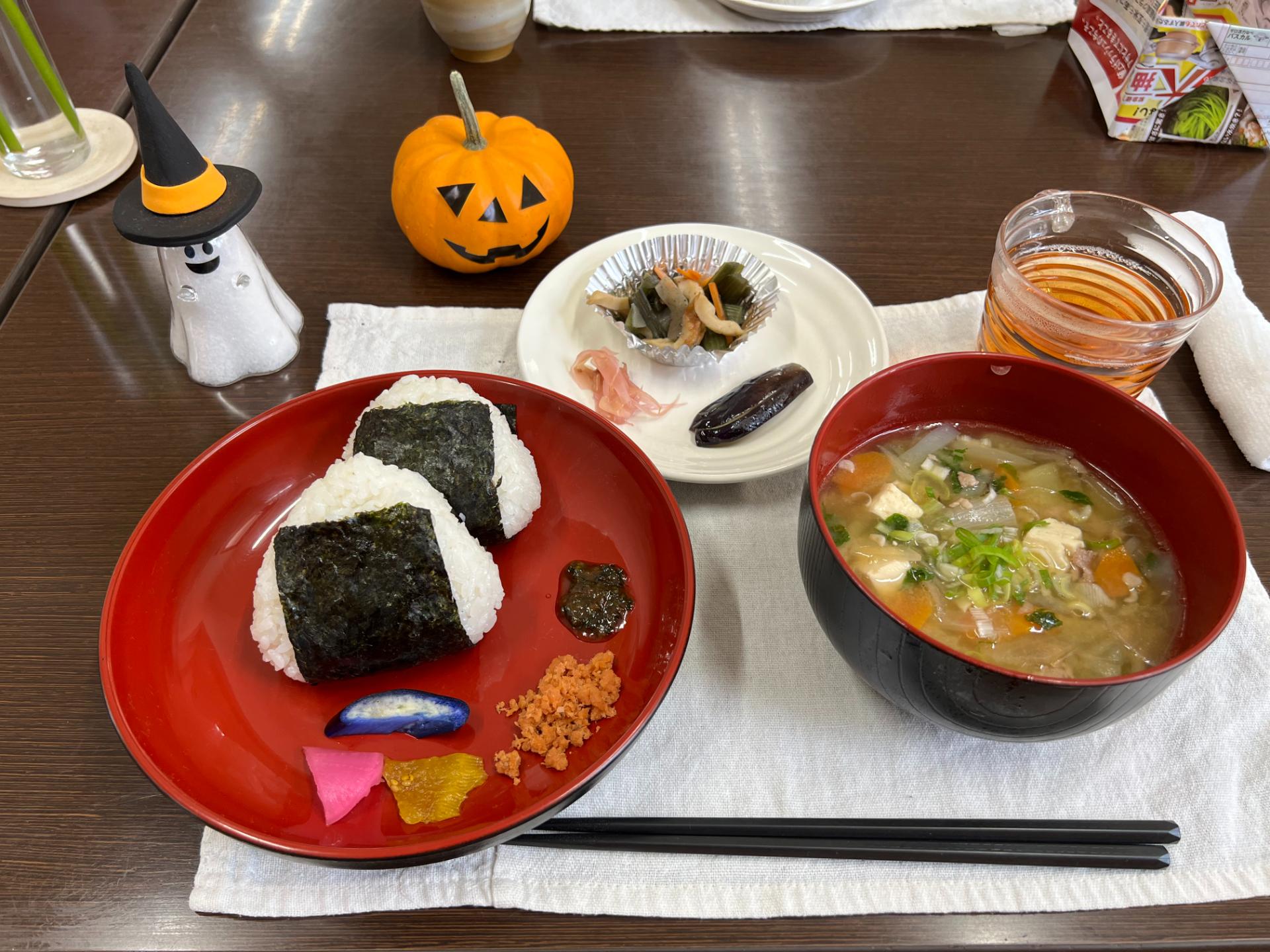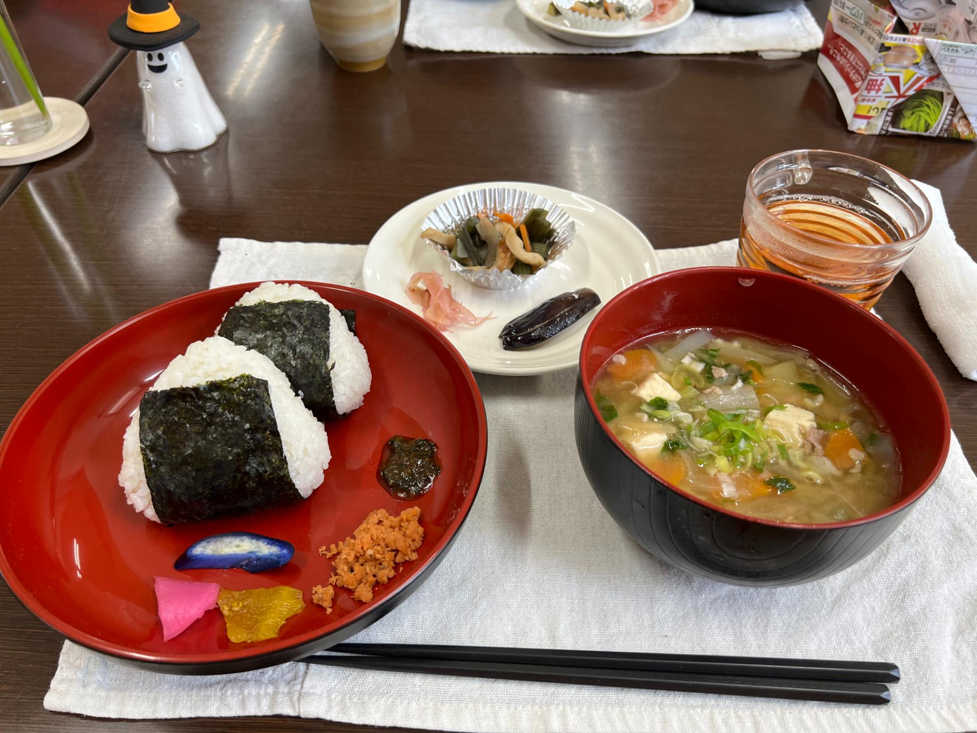 天高く馬肥える秋!今年も施設長の田舎で採れた「幻の東蒲米」で新米フェアを開催いたしました。メインディッシュは、新米のおにぎりと豚汁です。おにぎりの具材と付け合わせは、前半梅干しと鮭フレークに冬瓜の餡かけと茗荷の酢漬け・茄子のみそ炒め、後半はしそ味噌と鮭フレークに山あざみの炒め煮と茗荷の酢漬け・茄子の揚げびたし・・・大変好評で皆さん残さずに召し上がっていただきました。職員も毎日新米のおにぎりと豚汁で豪華なお昼ごはんとなりました。