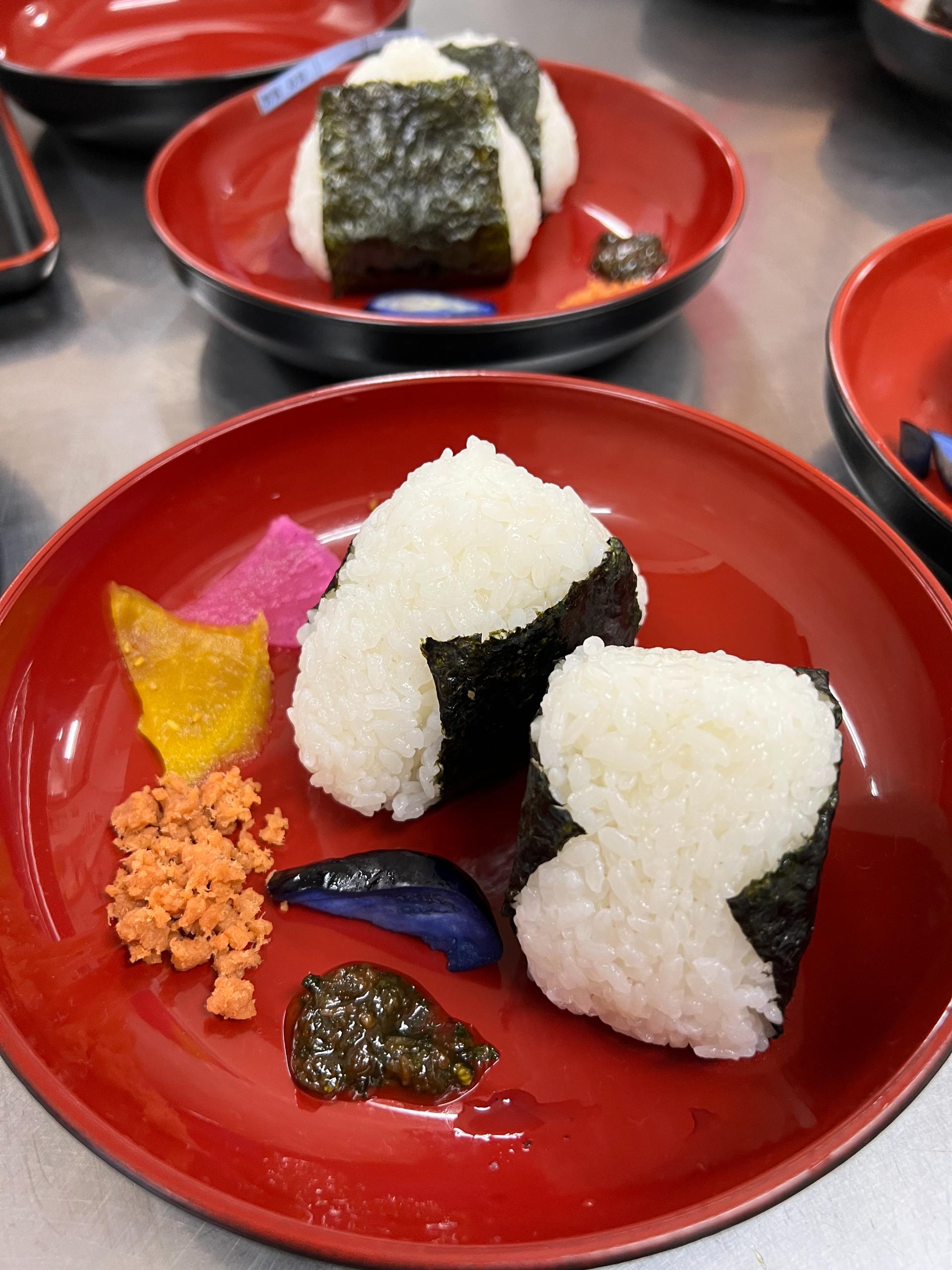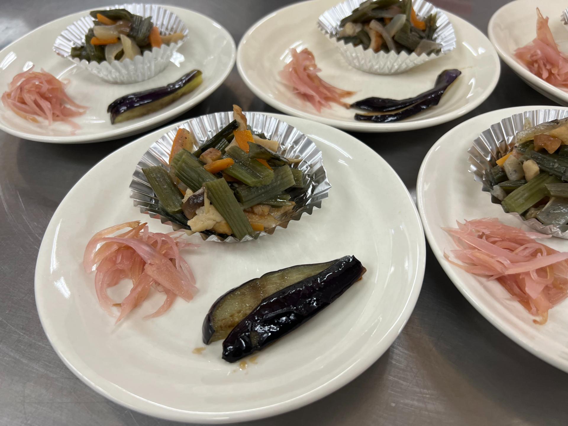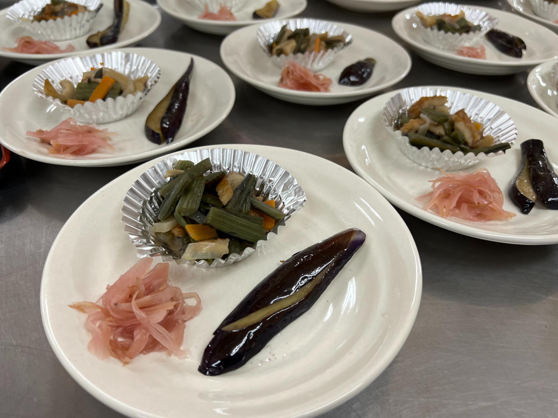 天高く馬肥える秋!今年も施設長の田舎で採れた「幻の東蒲米」で新米フェアを開催いたしました。メインディッシュは、新米のおにぎりと豚汁です。おにぎりの具材と付け合わせは、前半梅干しと鮭フレークに冬瓜の餡かけと茗荷の酢漬け・茄子のみそ炒め、後半はしそ味噌と鮭フレークに山あざみの炒め煮と茗荷の酢漬け・茄子の揚げびたし・・・大変好評で皆さん残さずに召し上がっていただきました。職員も毎日新米のおにぎりと豚汁で豪華なお昼ごはんとなりました。