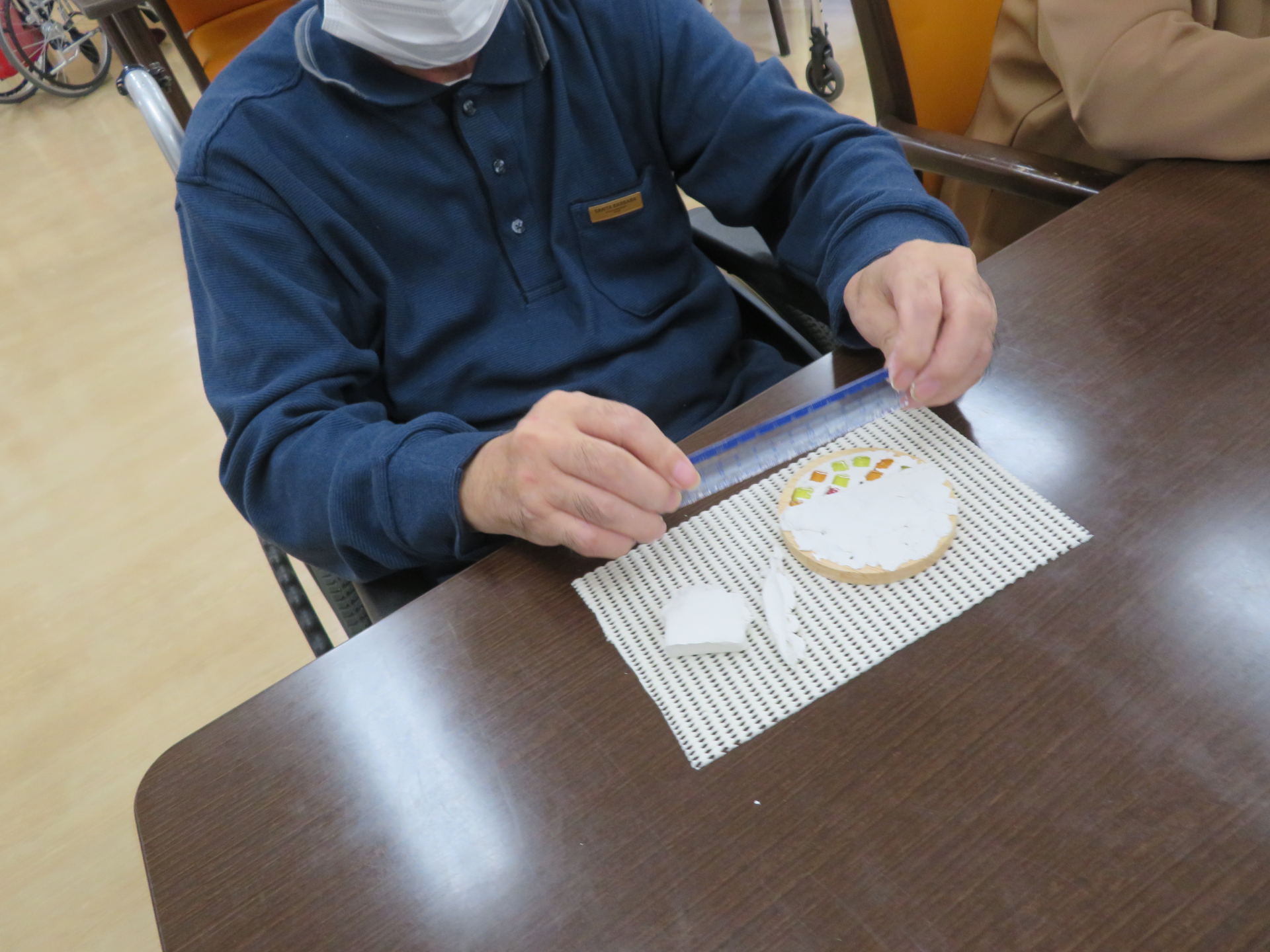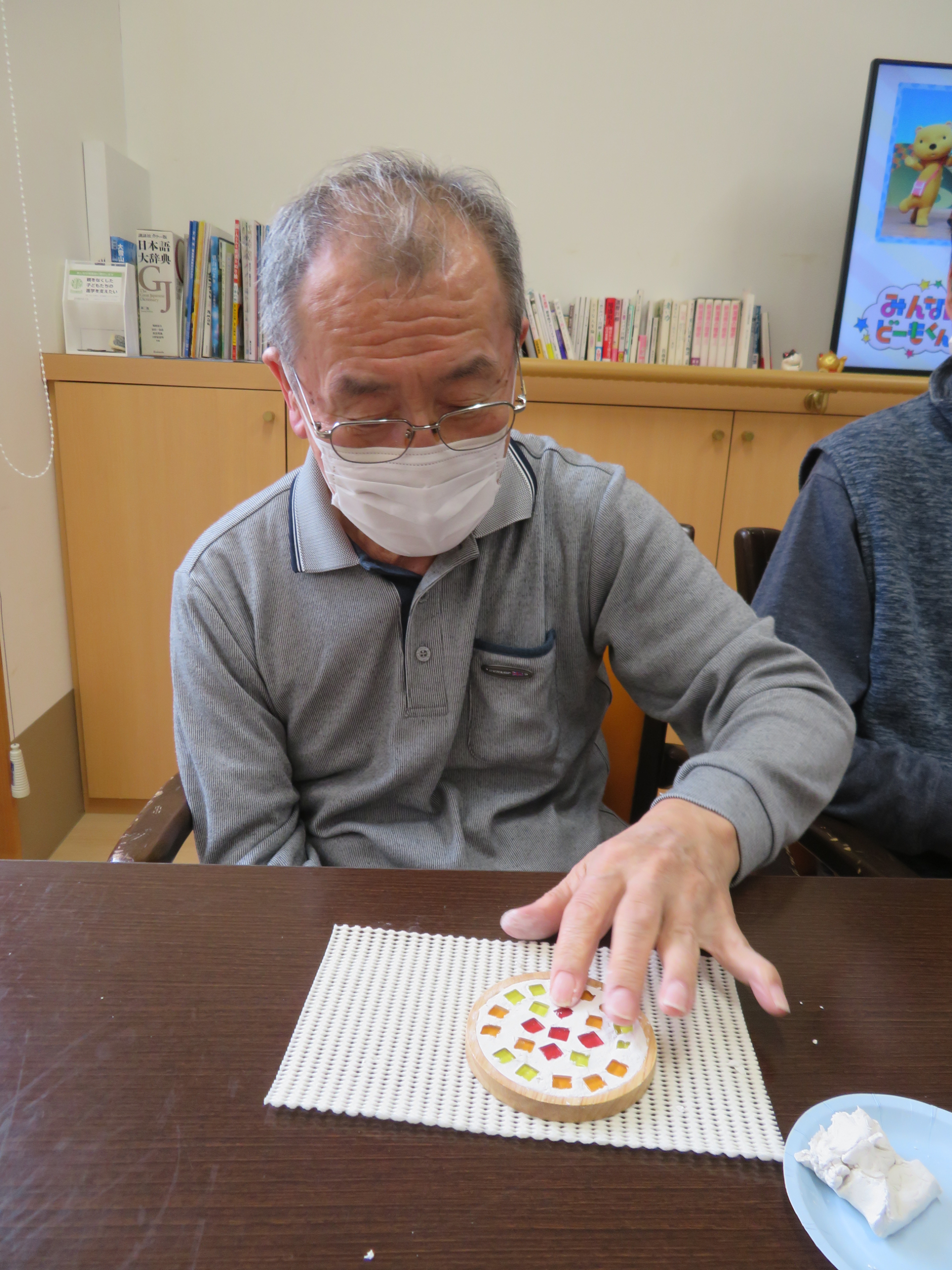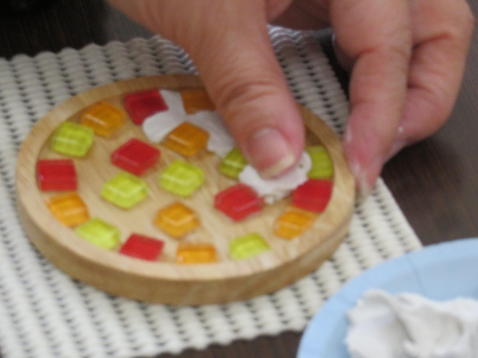 前回、ボンドで貼り付けたガラスタイルの間を、今回は粘土で丁寧に埋めていきます。細い棒等の道具を使って詰める方、粘土を小さくちぎったり細長くして詰める方、自分の指で力強く詰める方など、それぞれの工夫や個性が見られました。