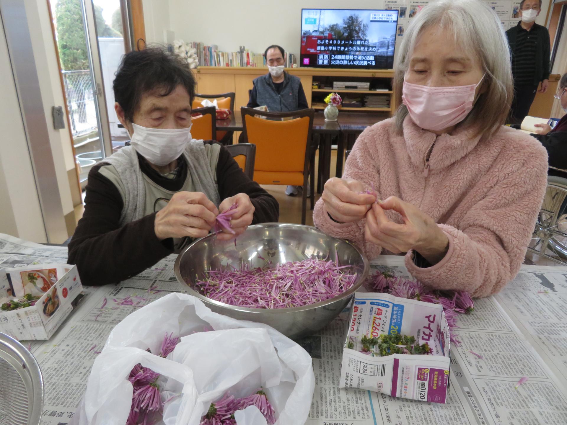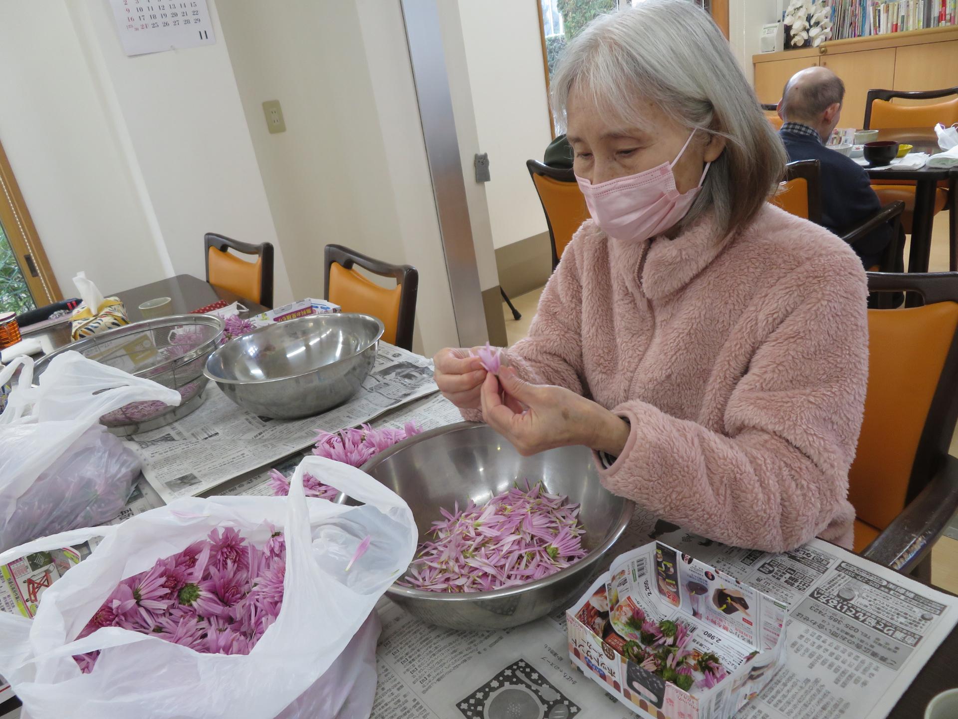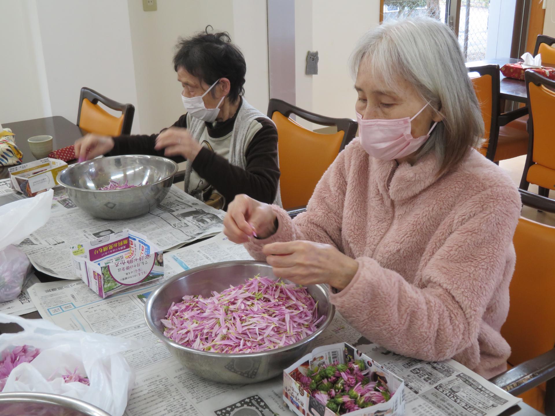 花を一つずつ丁寧にむしる姿はまさに 季節の手仕事。