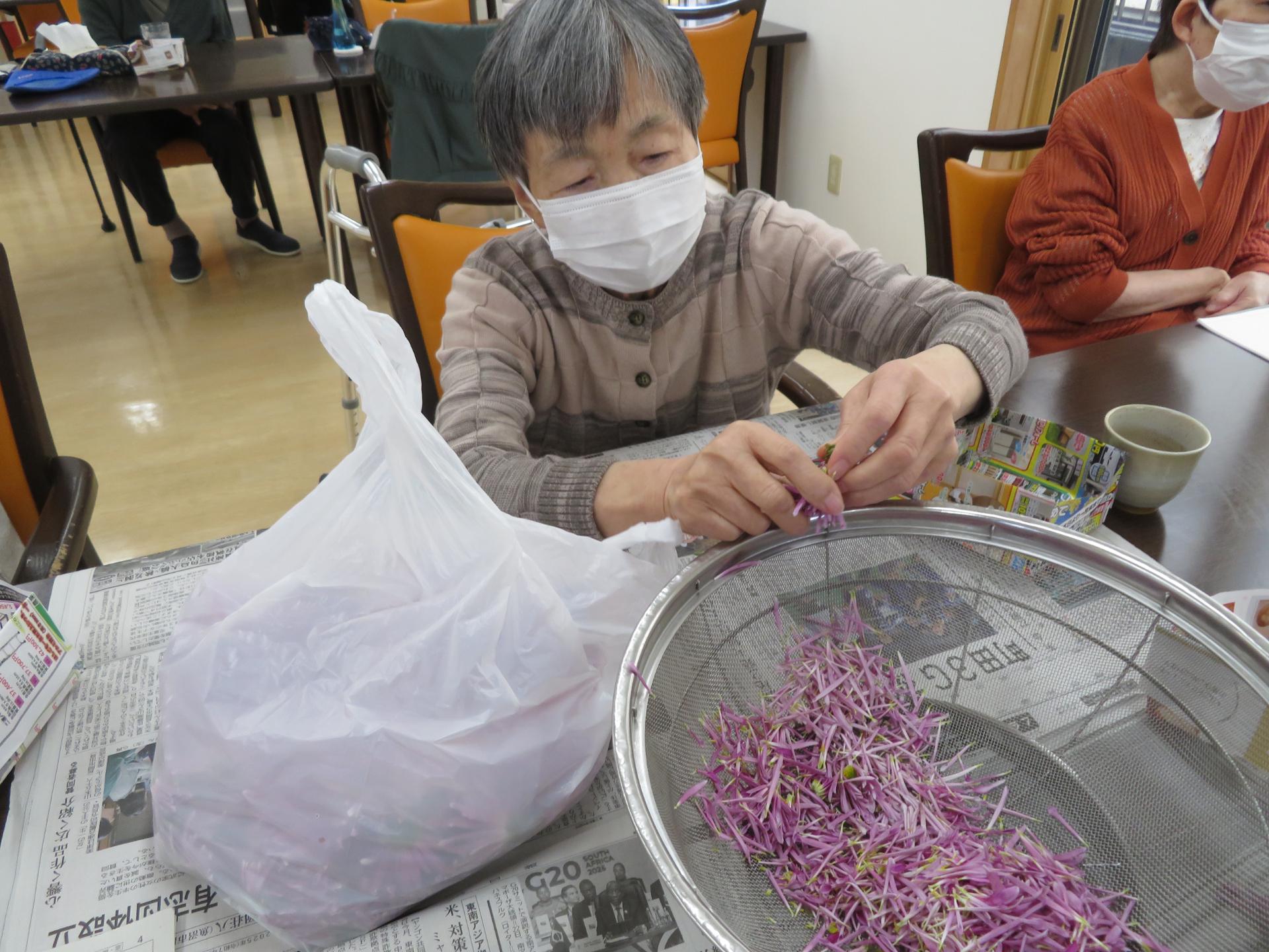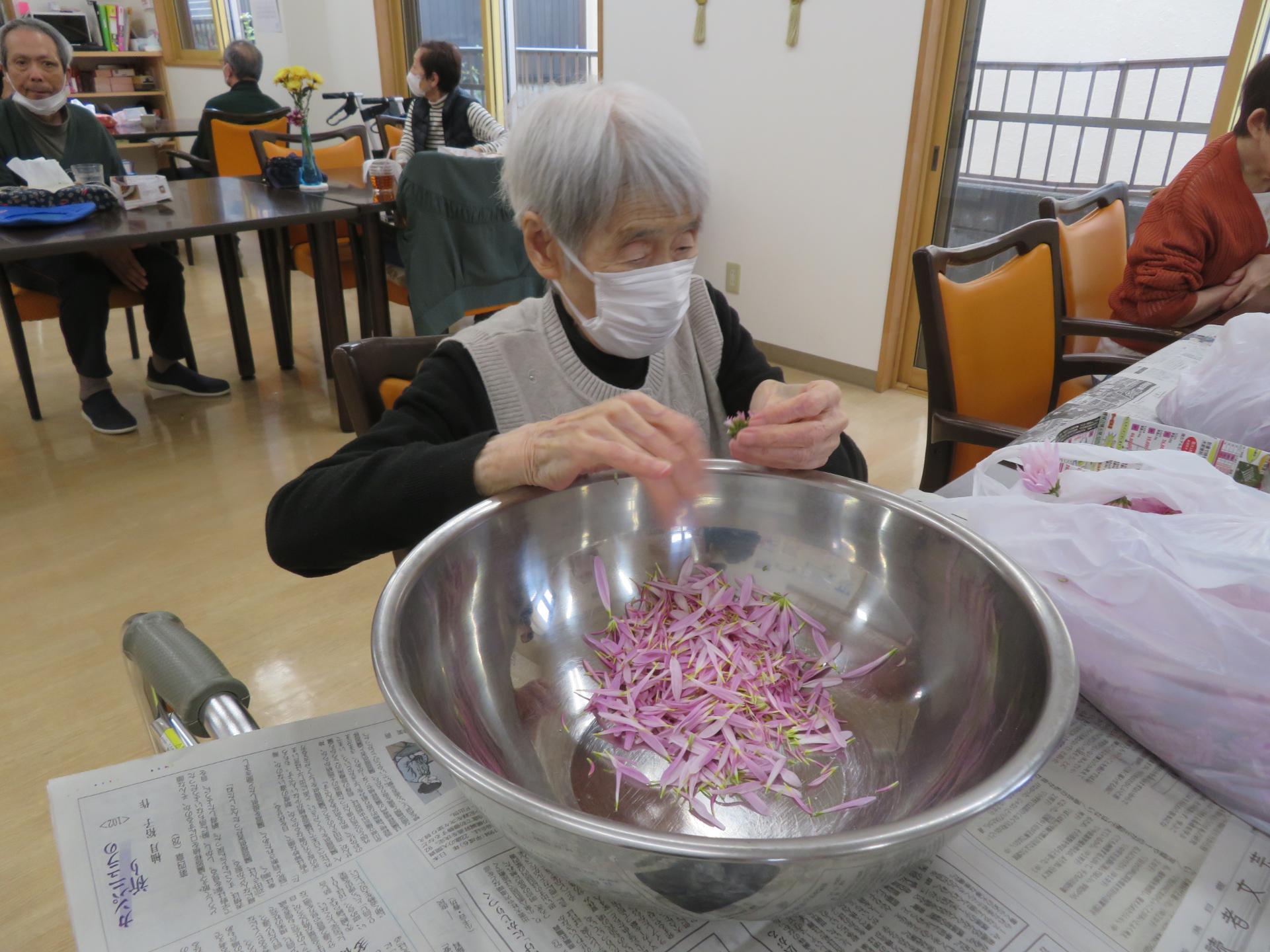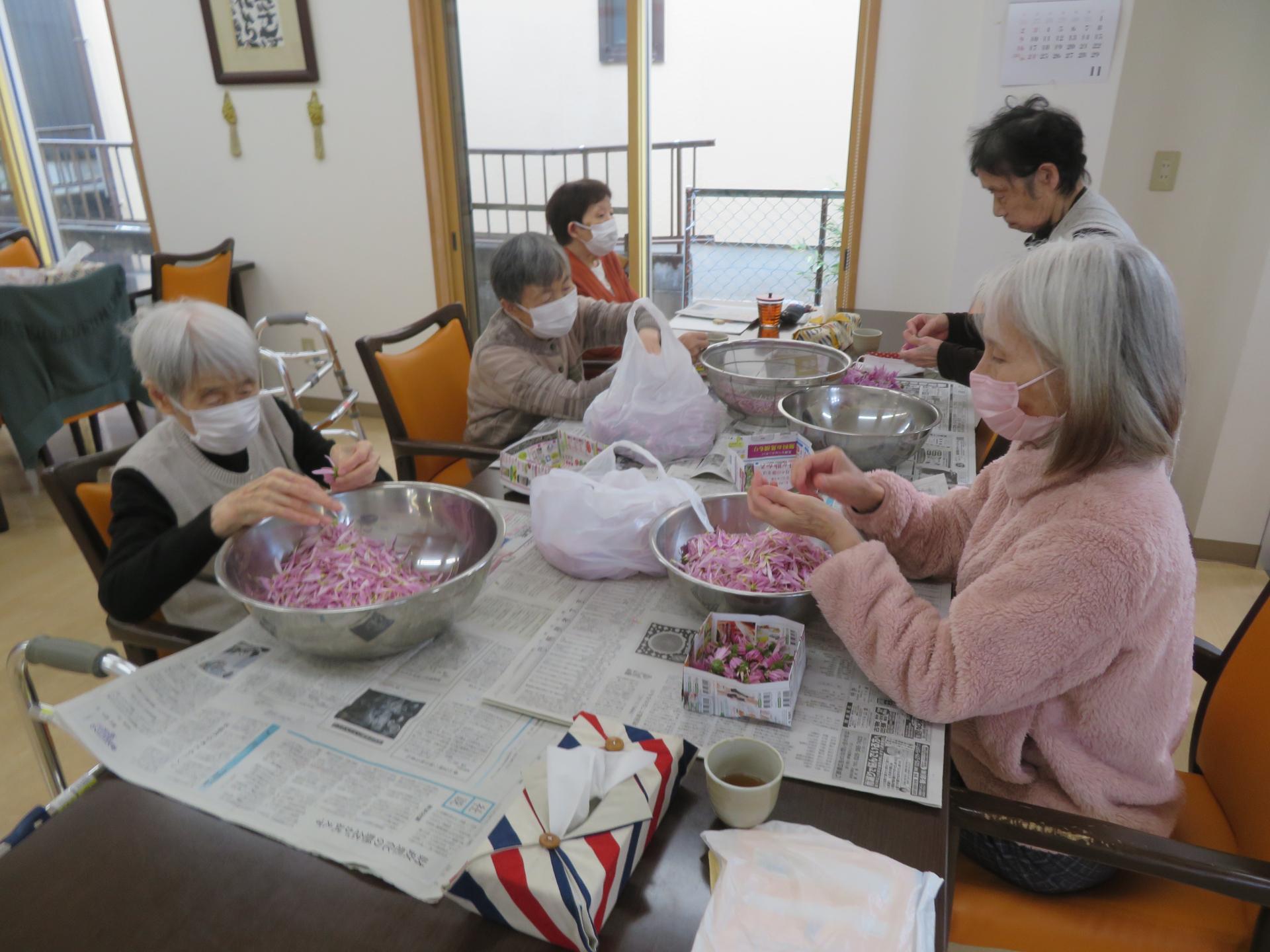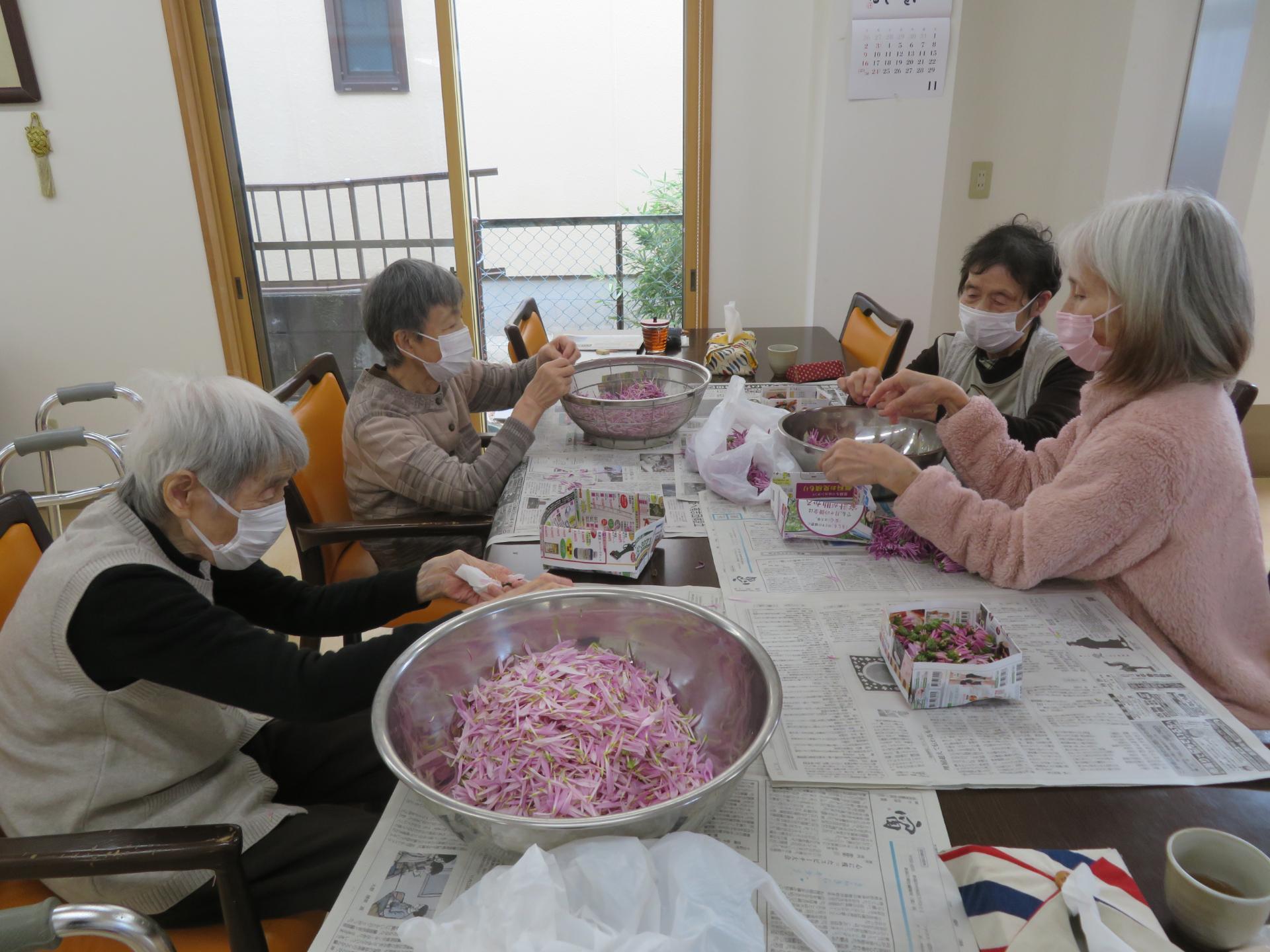 花を一つずつ丁寧にむしる姿はまさに 季節の手仕事。