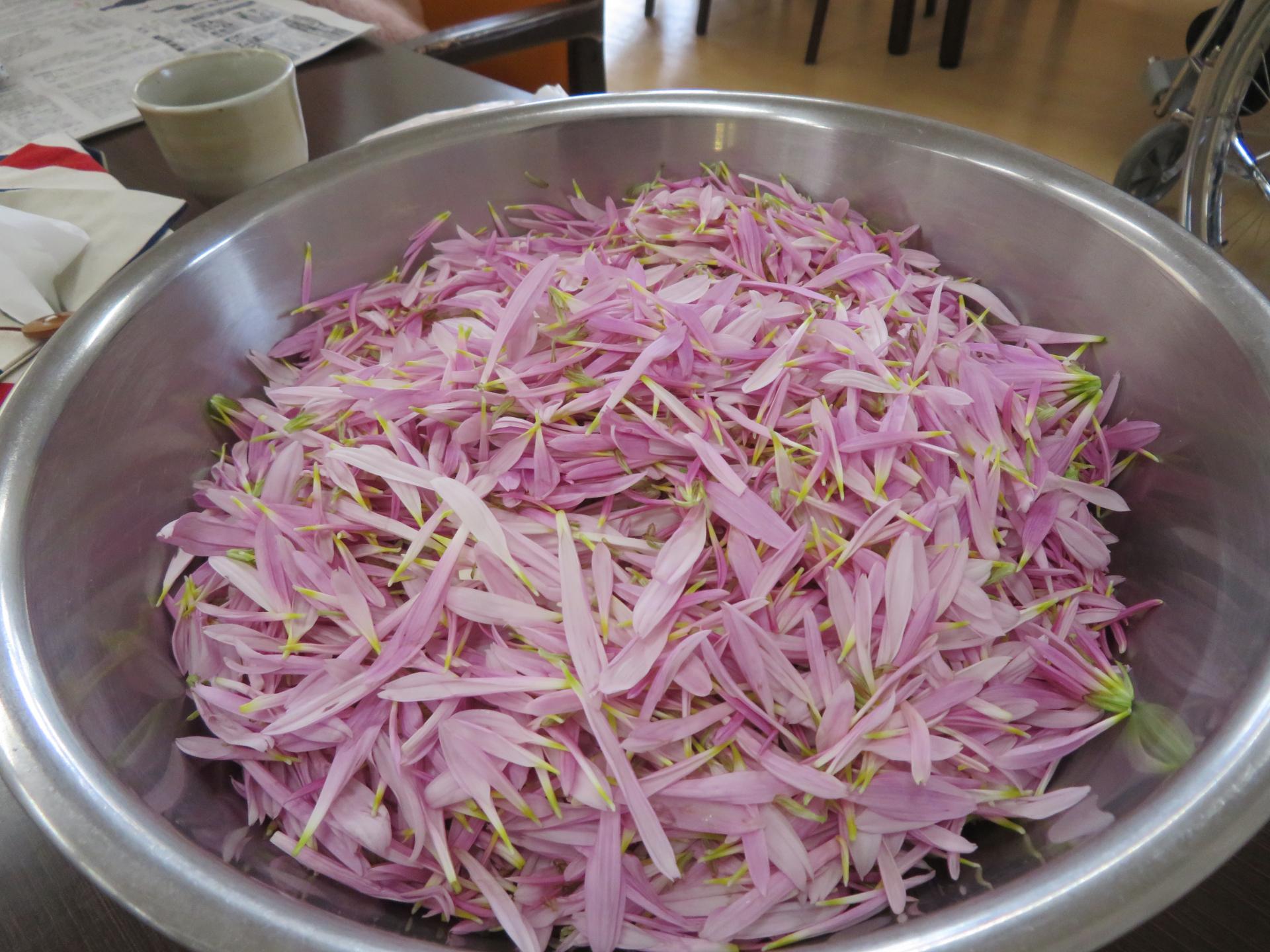 今日はリハブサロンDooで、利用者さまに かきのもとの花をむしり取る作業 をお手伝いしていただきました。