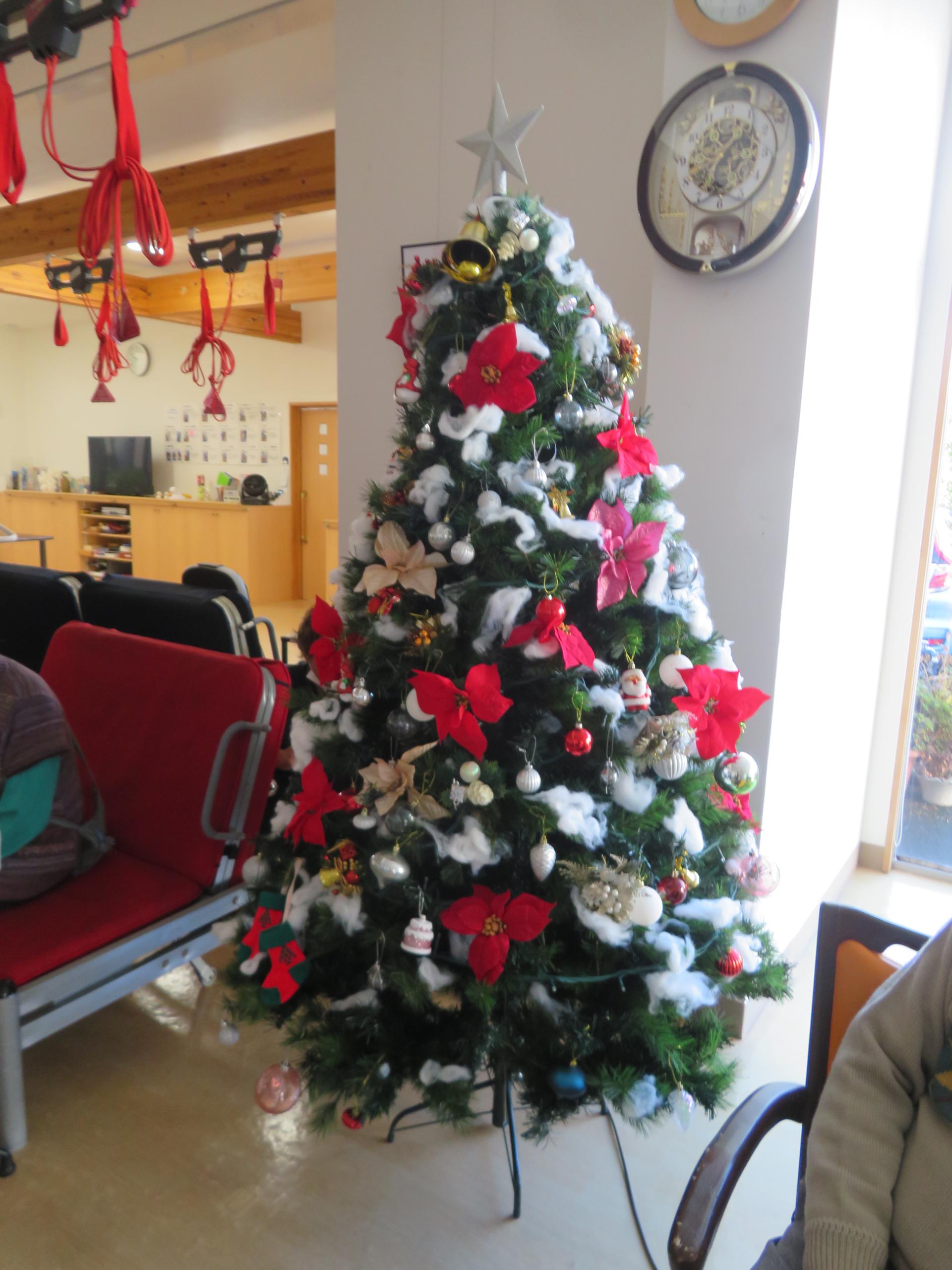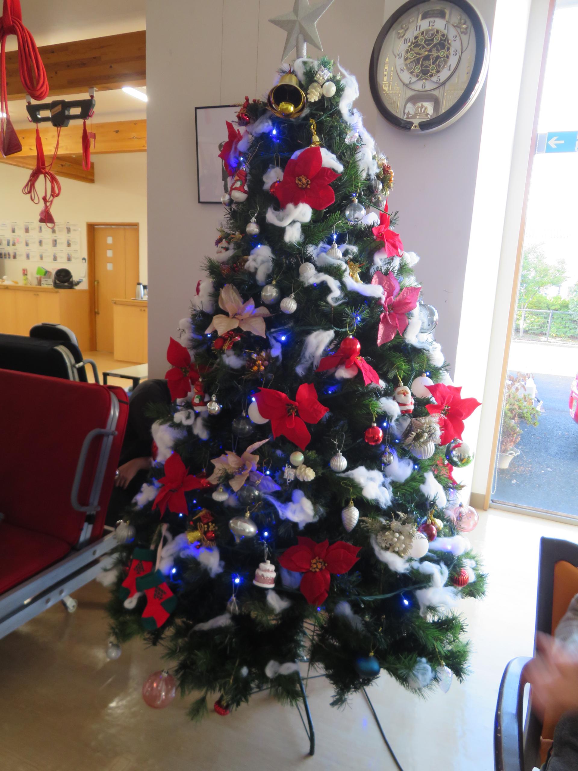 送迎車から降りたばかりの利用者様が、施設の中央にそびえる“身長よりも大きなクリスマスツリー”に思わず足を止めてしまうほど。