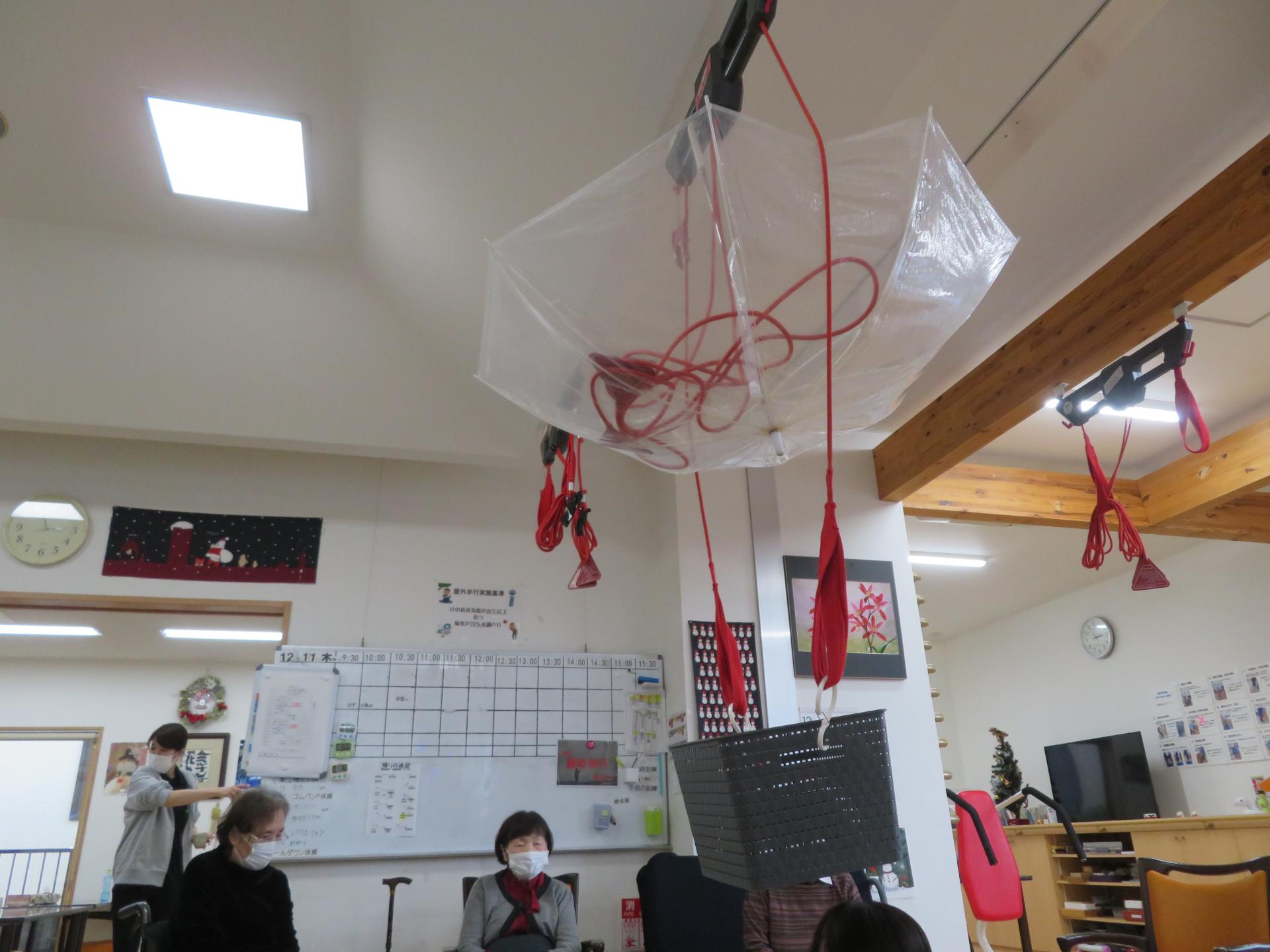 天井からは逆さになった大きな傘がぶら下がっていて、そこに向かって「えいっ!」と雪玉を投げ込みます。
