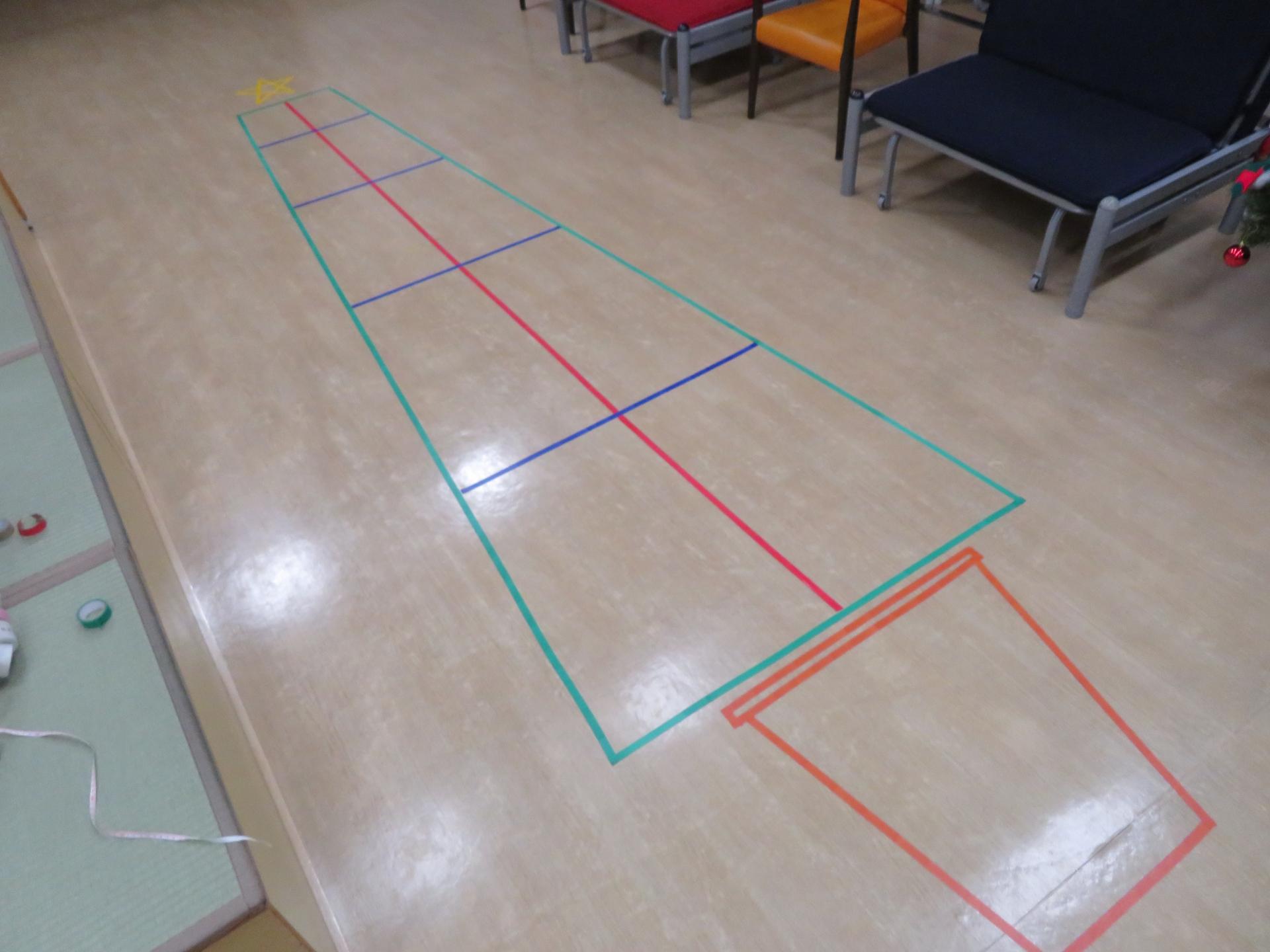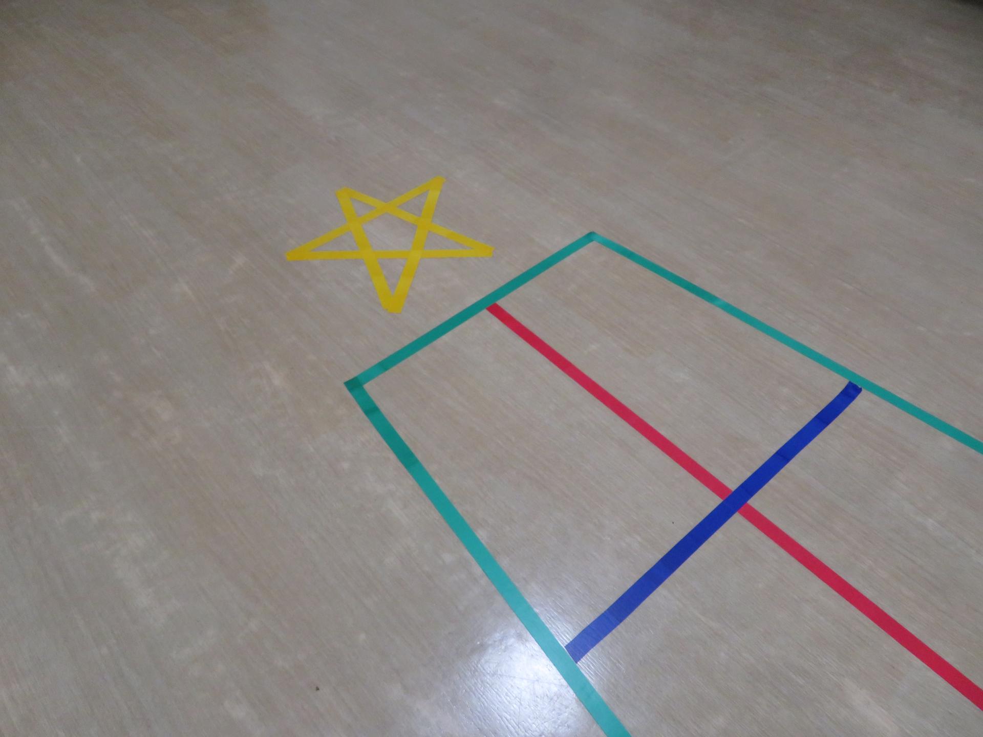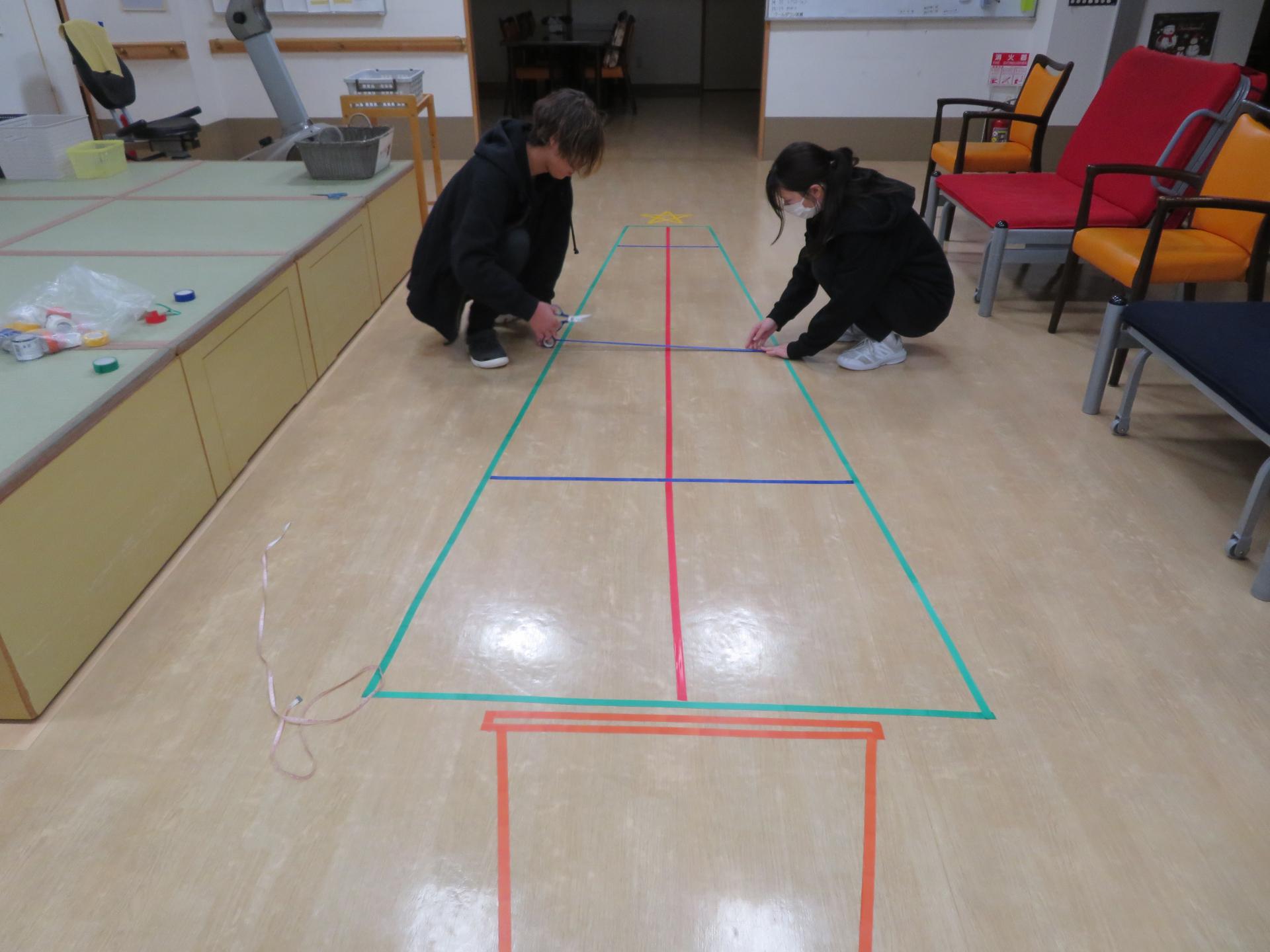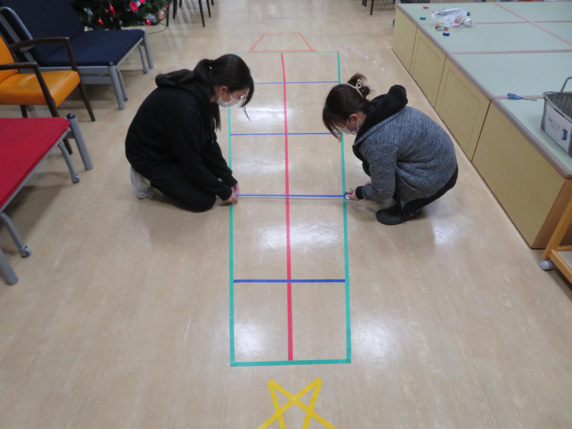 今回は、ビニールテープを使って職員Pと愉快な仲間たちで、床いっぱいに描きました( ̄▽ ̄)ニヤ