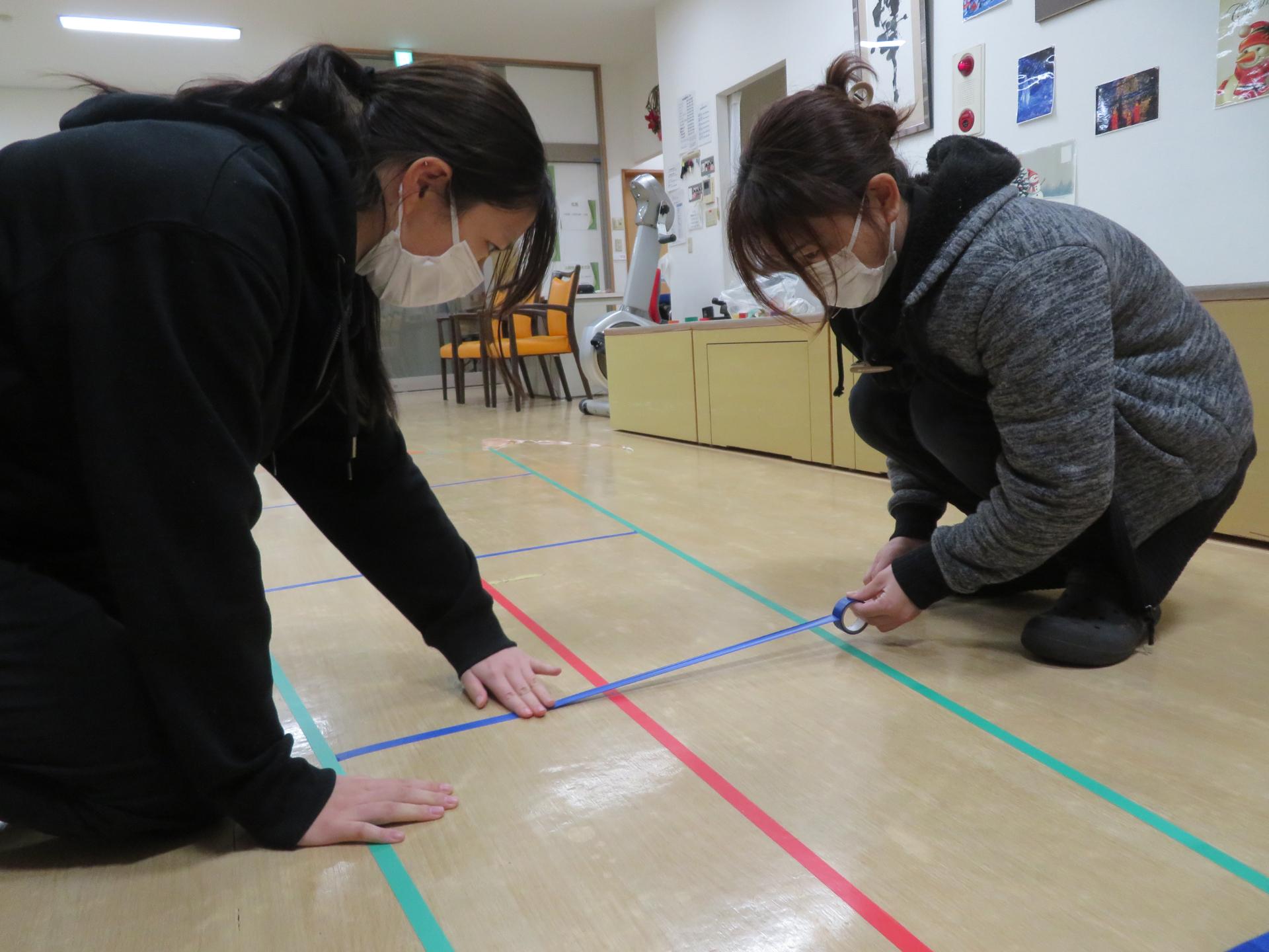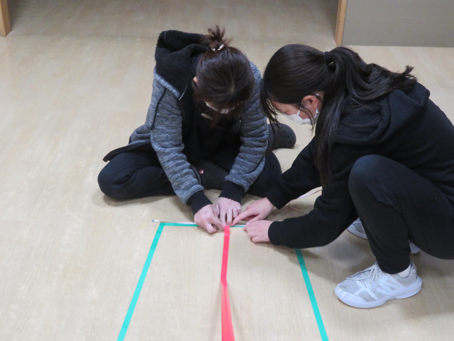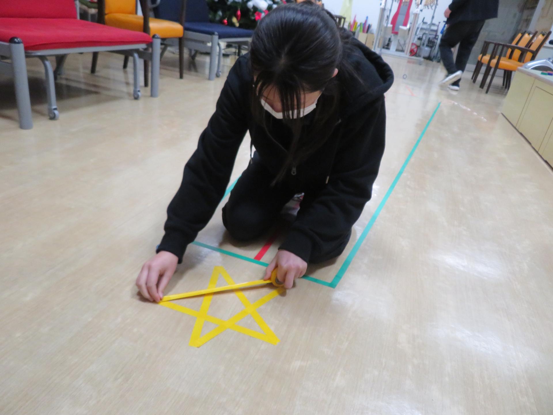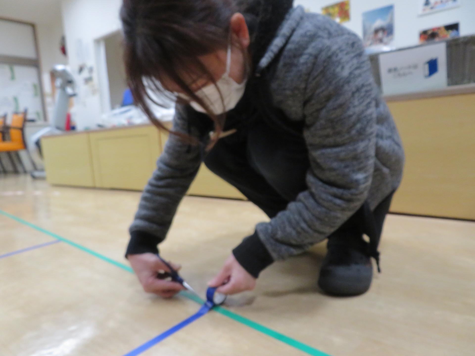 今回は、ビニールテープを使って職員Pと愉快な仲間たちで、床いっぱいに描きました( ̄▽ ̄)ニヤ