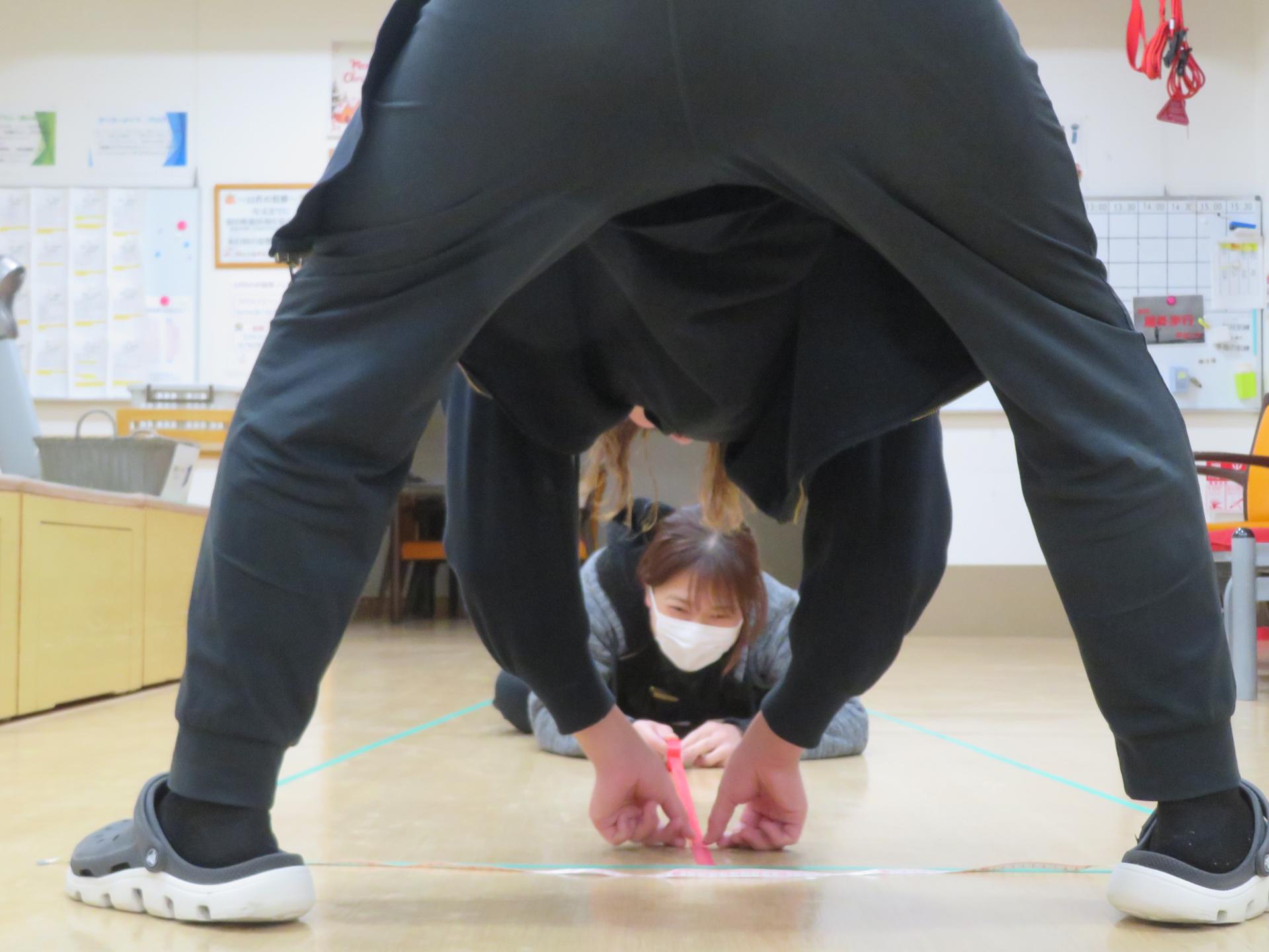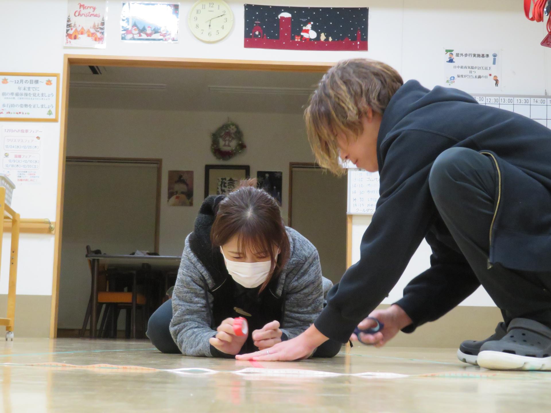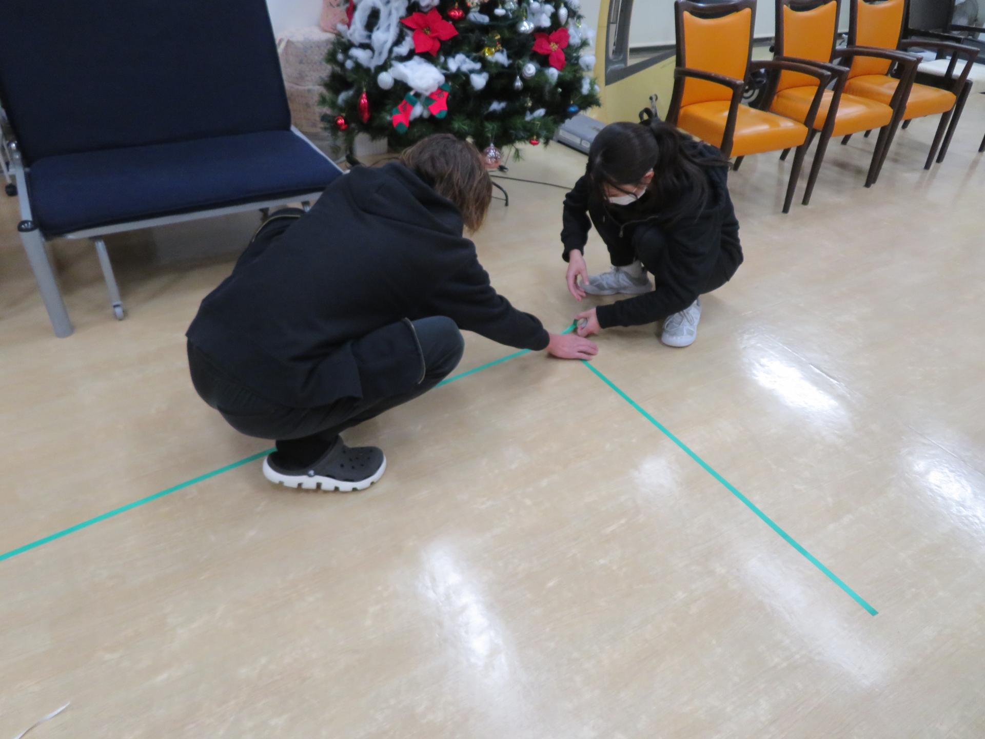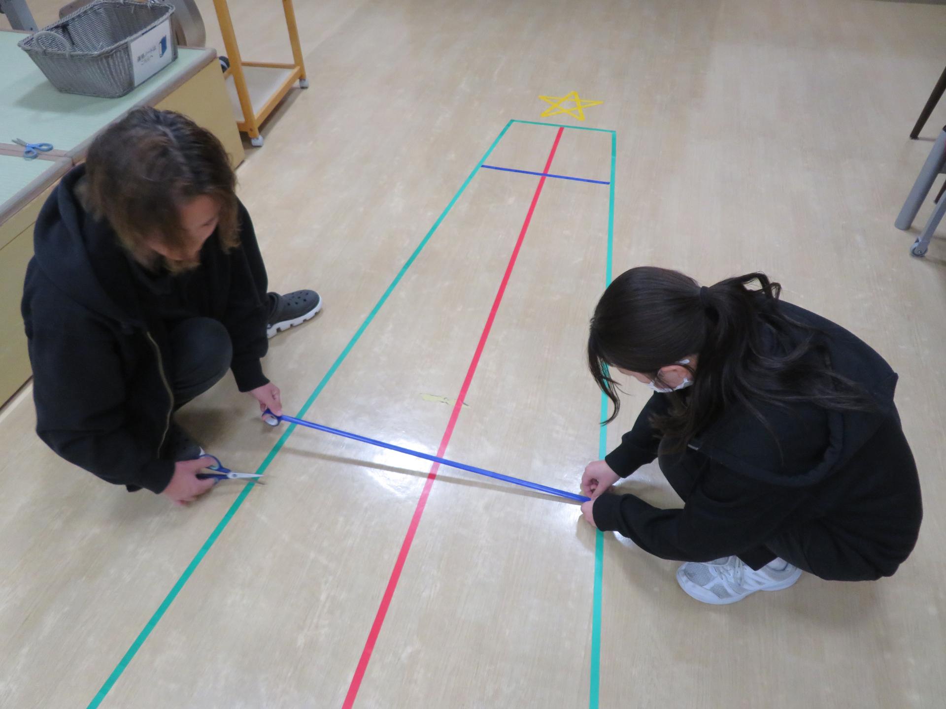 今回は、ビニールテープを使って職員Pと愉快な仲間たちで、床いっぱいに描きました( ̄▽ ̄)ニヤ