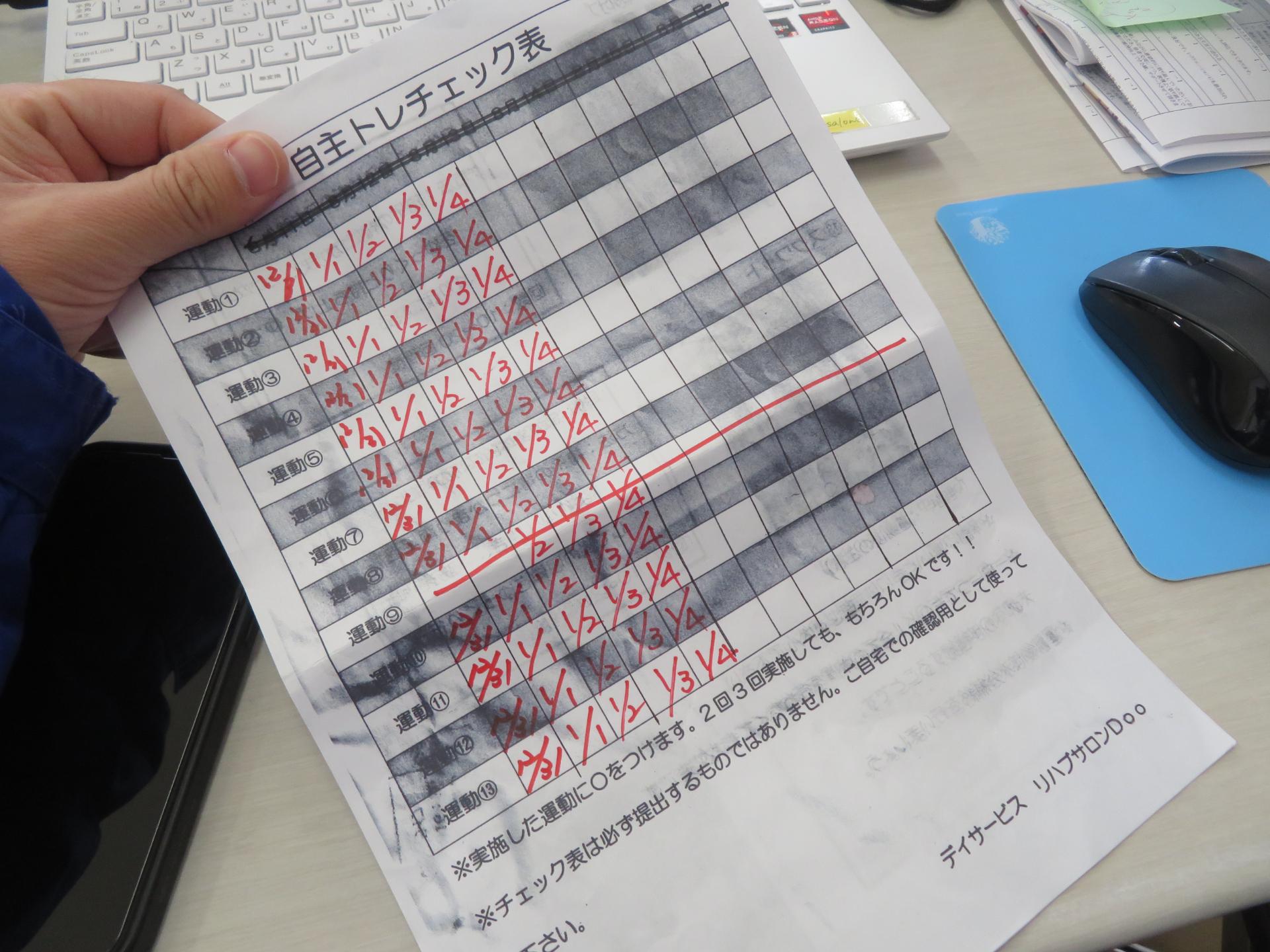 以前お渡しした、運動のチェック表。