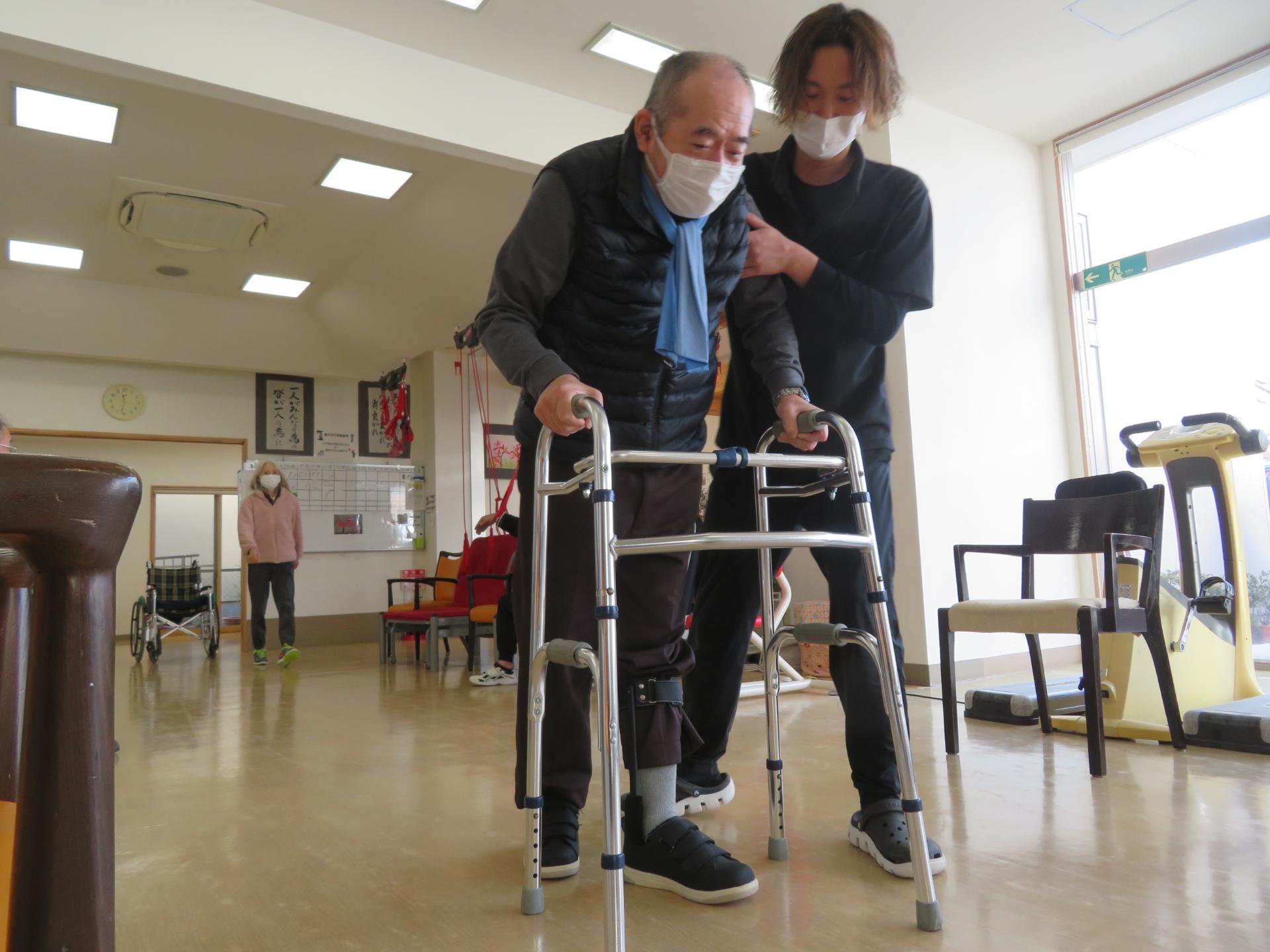 理学療法士による個別リハビリでは、ストレッチ、歩行練習、姿勢修正。