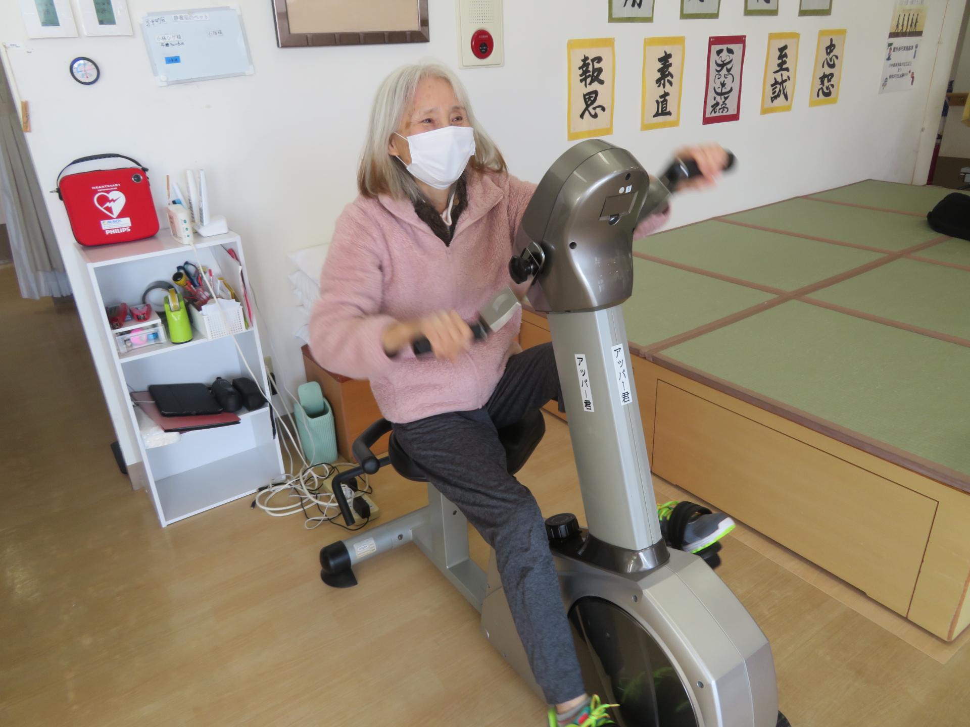 自らサイクルマシンに乗り、
