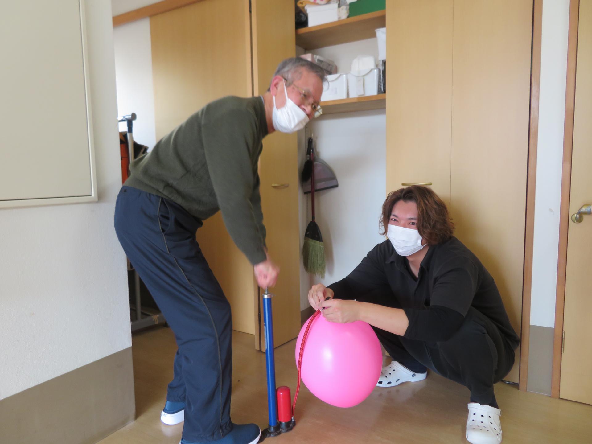 空気を入れている利用者様と、横で見守る職員。