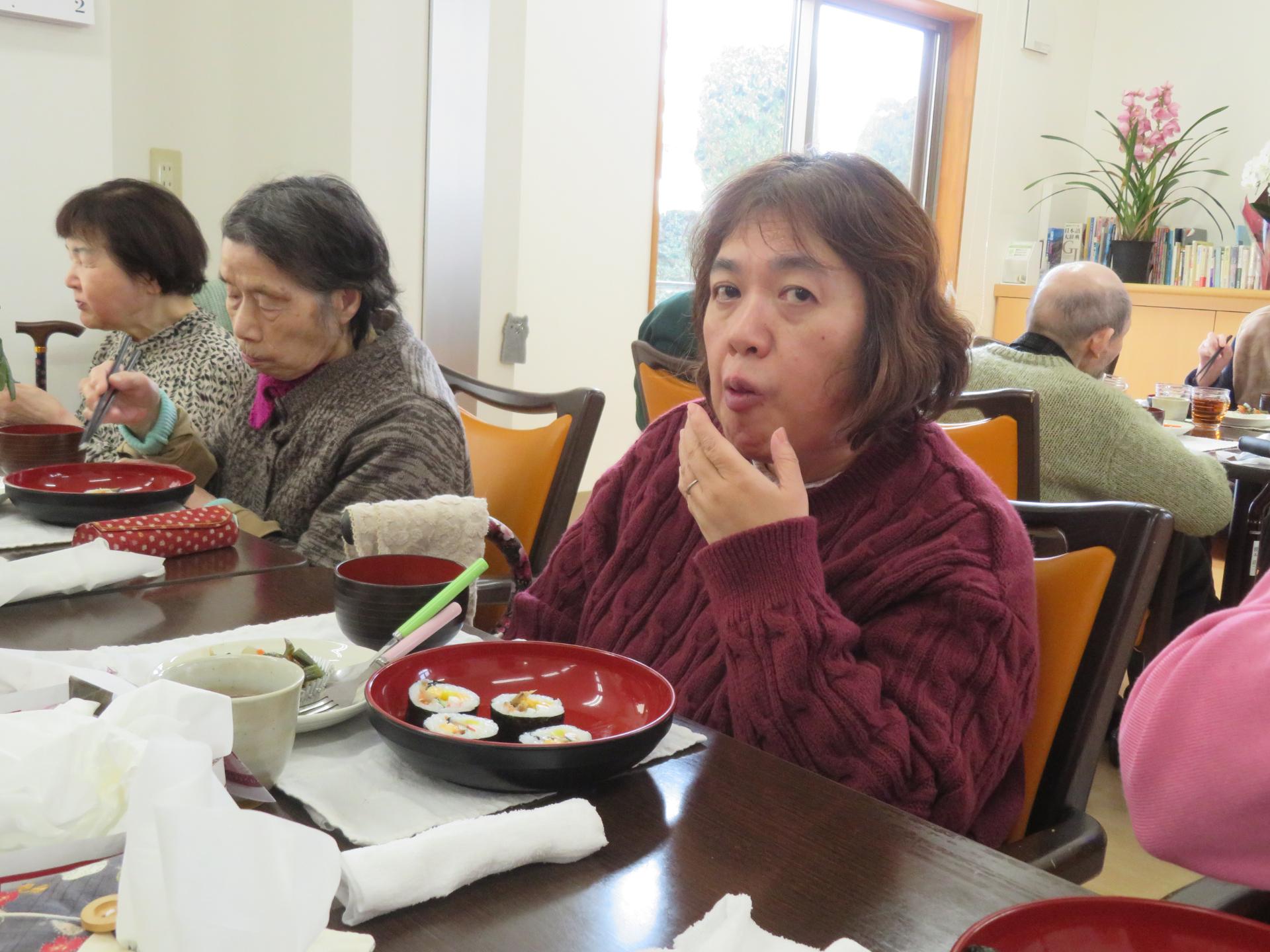 「恵方を向いて、黙って食べましょうね〜」