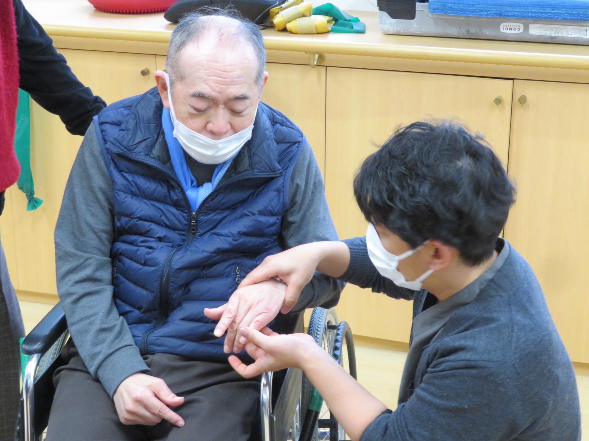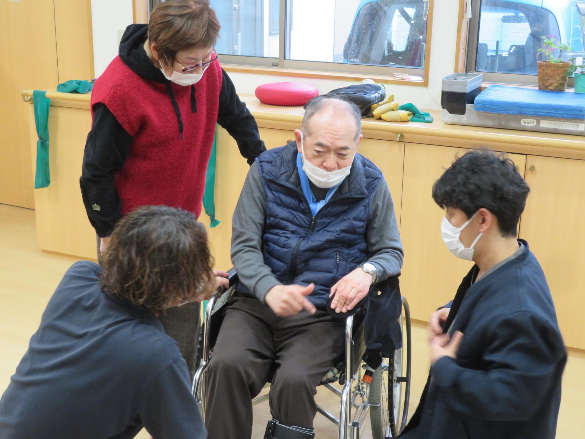 理学療法士と並んで立ち、利用者様の身体の状態を細かく評価し、