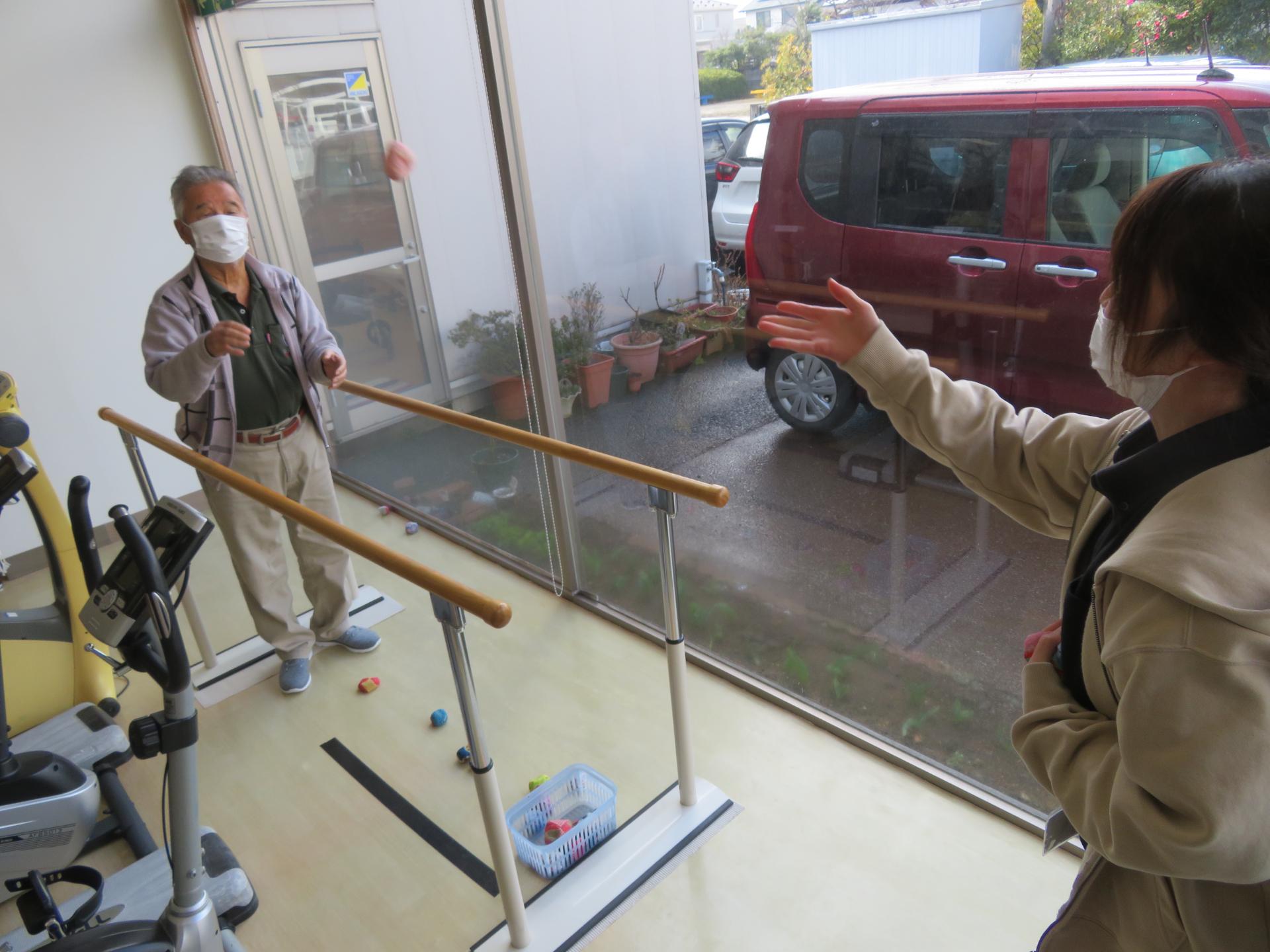 リハブサロンDooの窓際の方で、作業療法士さんと利用者様が何やら楽しそう。